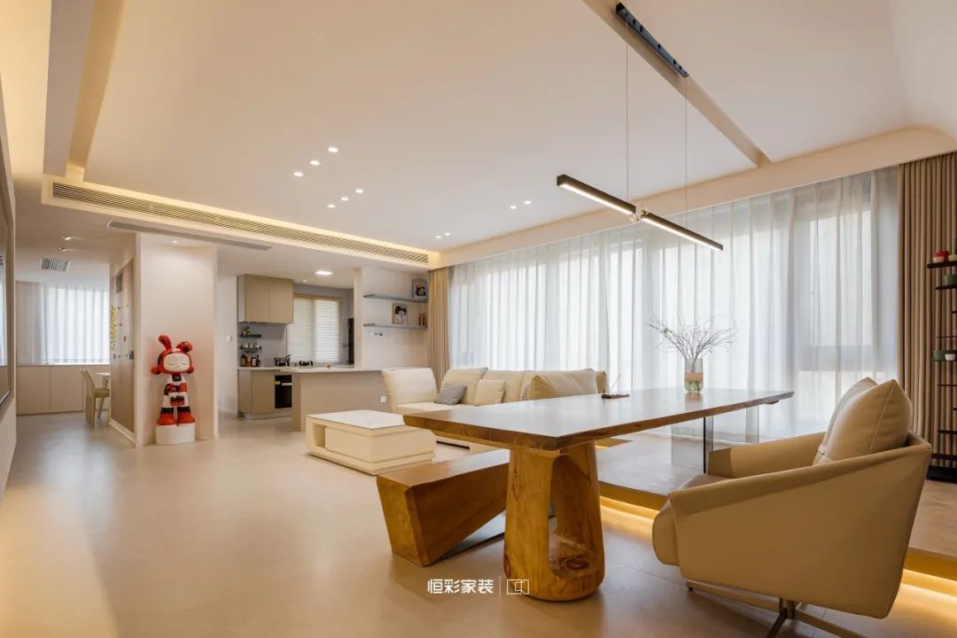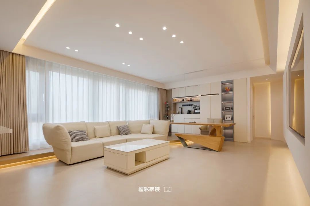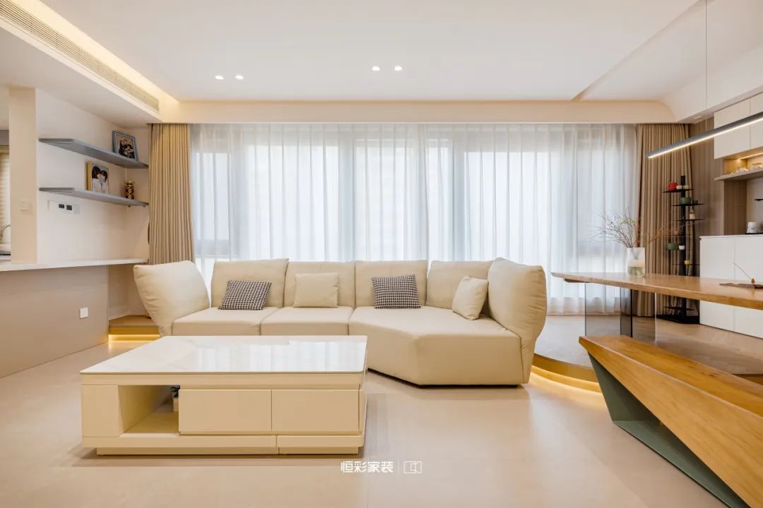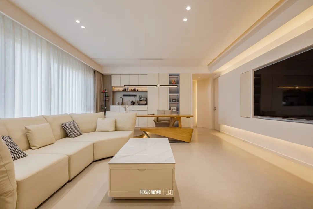 客厅整面大飘窗,自然光线充足地洒入室内,光影交错间使整个空间显得格外明亮和通透。无主灯设计简约又不失大气,隐藏光源营造出柔和的氛围,奶呼呼的白色布艺沙发如同一片温柔的云,带来无限的舒适感和温馨感。