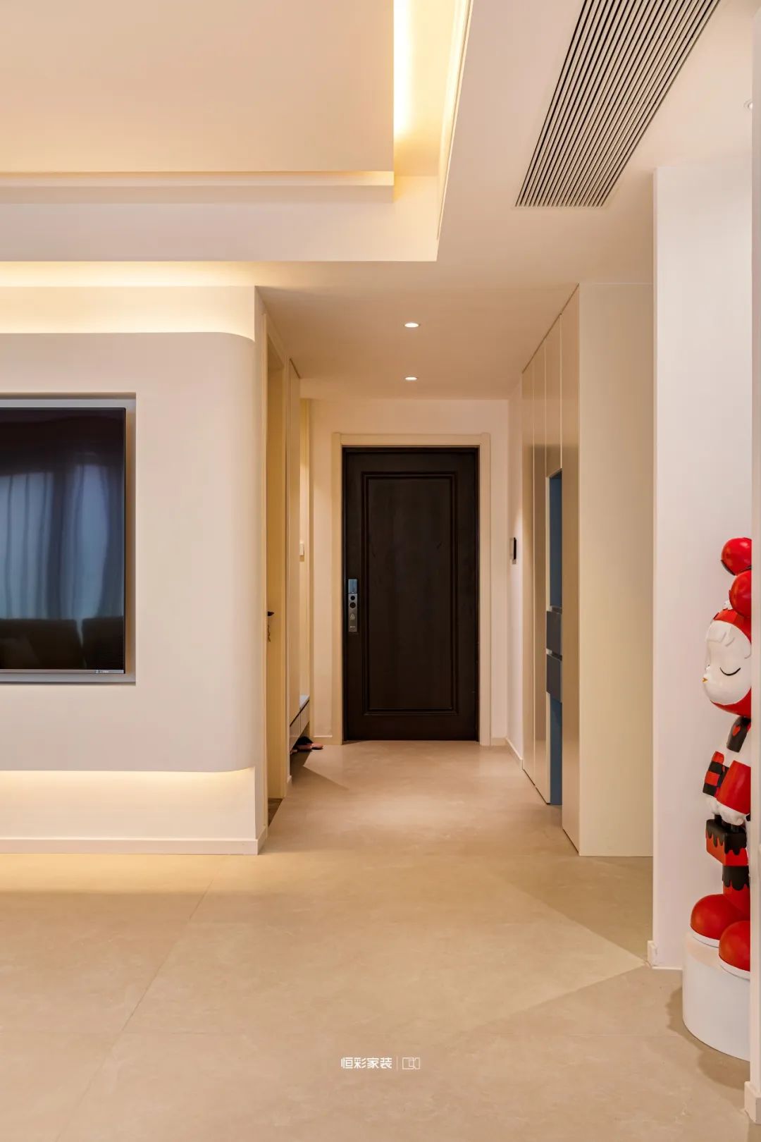 入户无玄关,需“造”出一个玄关区满足出入需求,进门右手边靠墙做玄关收纳柜,同时打造了换鞋凳+挂衣区,玄关柜中暗藏灯带,整体的氛围感超强,颜值抗打又不占空间。左侧做补充收纳柜,隐形柜门实用美观。