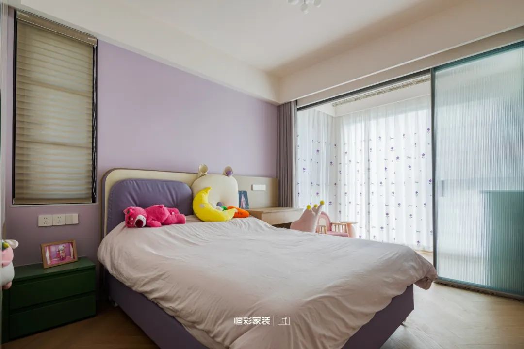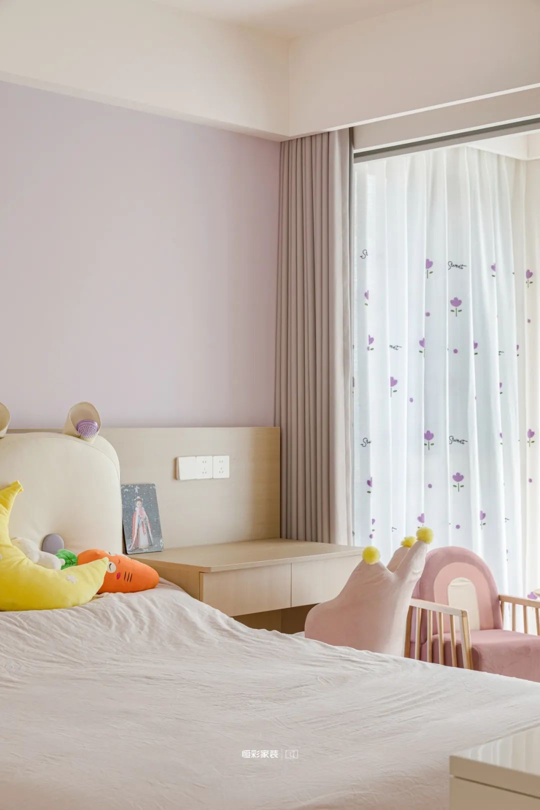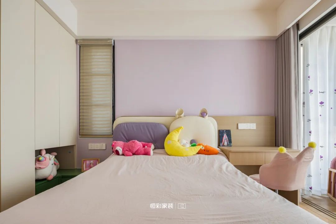 儿童房设计充满了童趣与可爱,以活力的紫色和粉色为主调,充分尊重孩子的喜好,打造出一个梦幻般的空间。柔和的紫色和粉色不仅给房间增添了一份温馨,还让整个空间显得生动活泼,充满了孩子的天真与幻想。