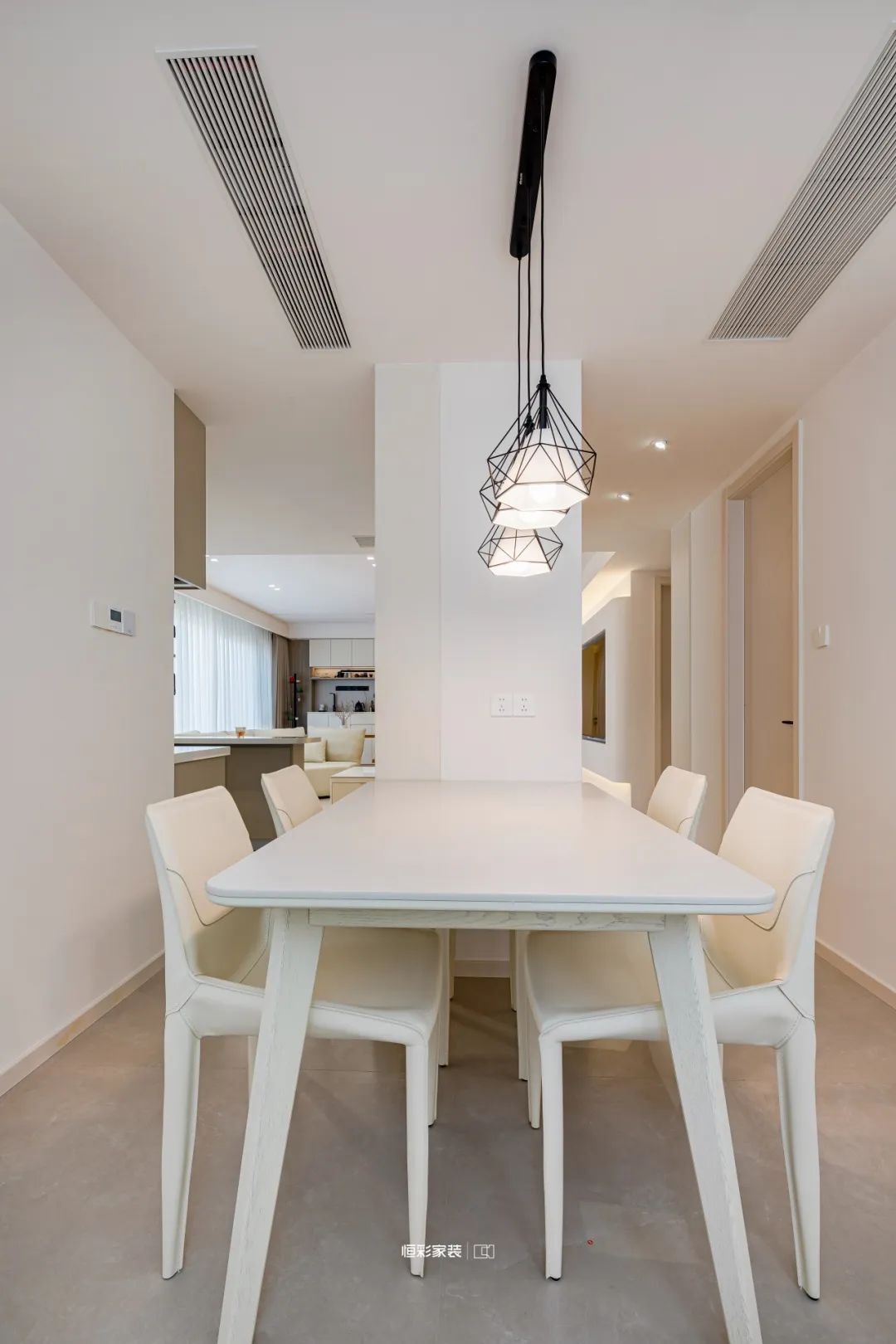餐厅与厨房仅半墙相隔,餐桌上方,一盏黑色钻石吊灯垂下,作为餐厅的主光源,不仅提供了充足的照明,还增添了设计感和层次感。独特的灯具造型犹如一件艺术品,为整个空间注入了一份时尚气息。这盏黑色吊灯与餐桌椅的白色形成鲜明对比,提升了空间的视觉冲击力和美观度。