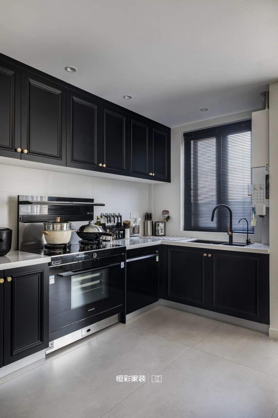 厨房L型台面,白与黑的经典配色好似画家的调色板,简洁又不失艺术感。黑色电器浑然一体,每一笔都是艺术创作。百叶窗下光影交错,随着时间流转轻轻跳跃。