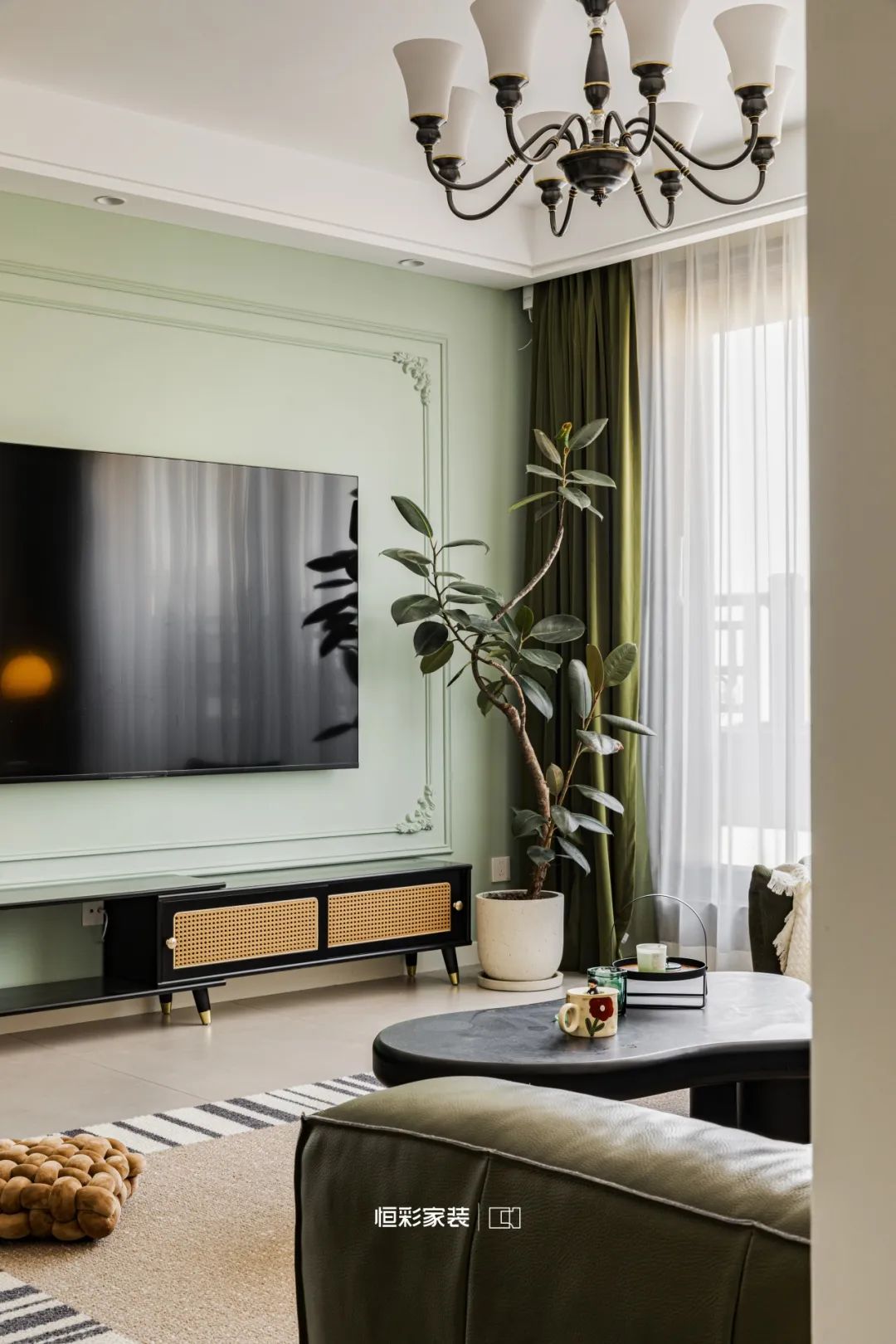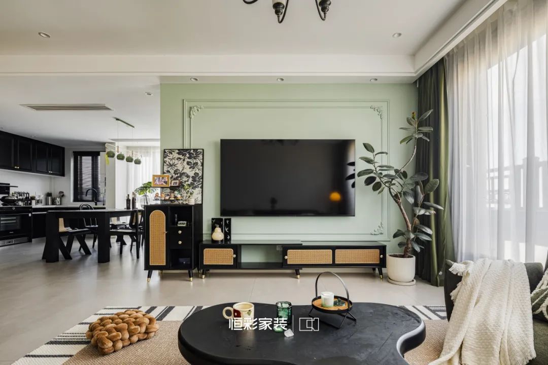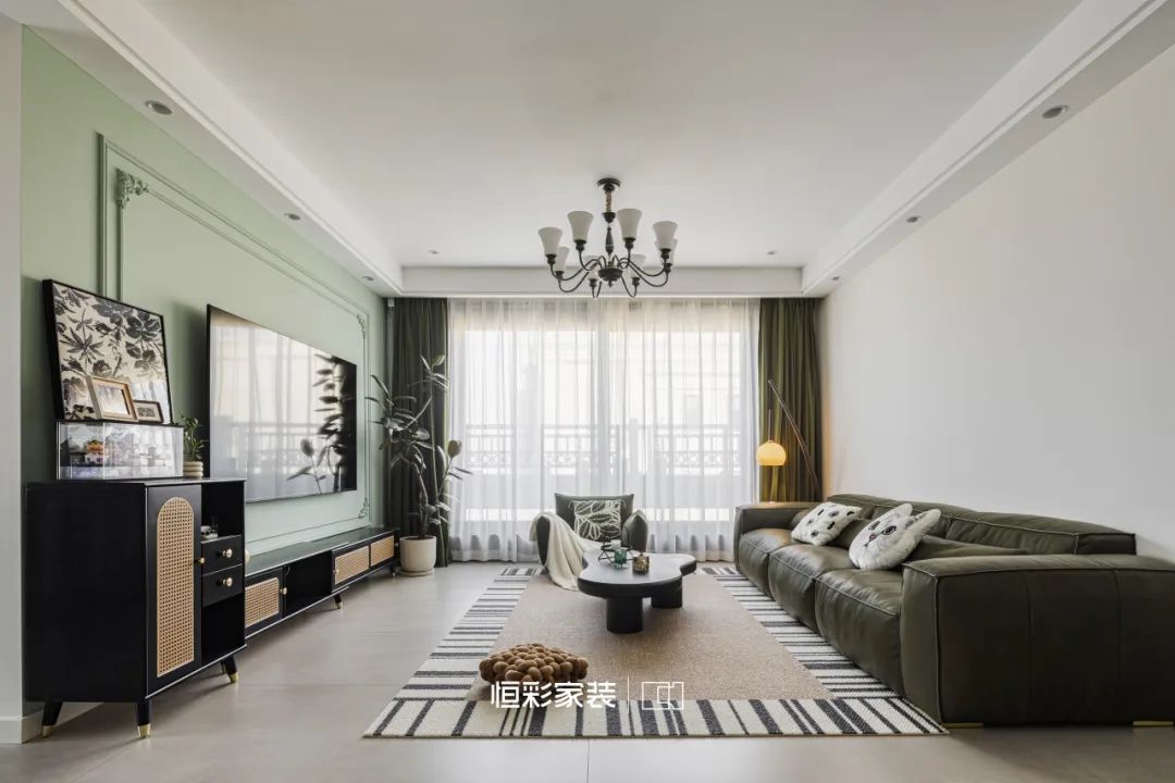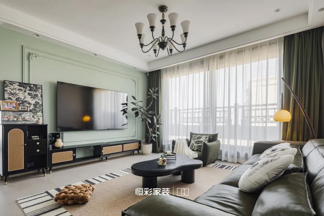 电视背景墙上绿色乳胶漆与法式石膏线如同大自然的画笔在室内轻轻挥洒,绘出一片静谧森林的轮廓。这一抹绿色仿佛是林间深处的一汪清泉,悄无声息地漫过法式古韵。