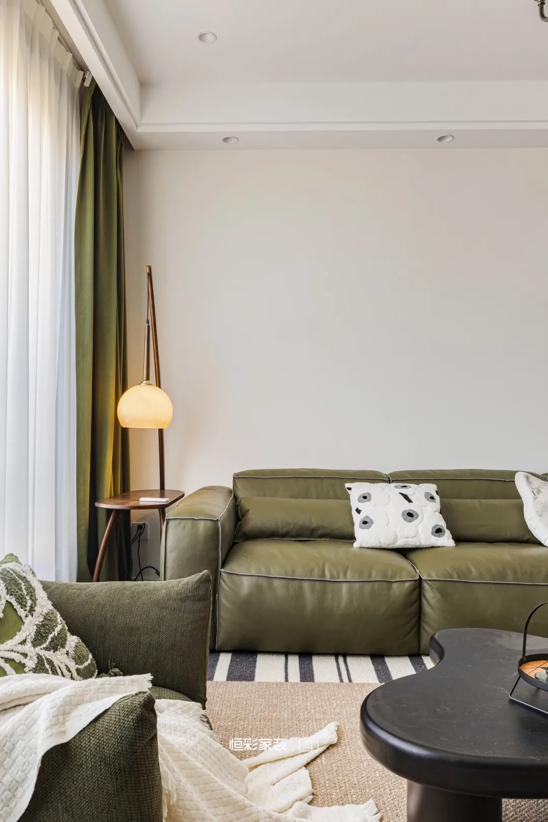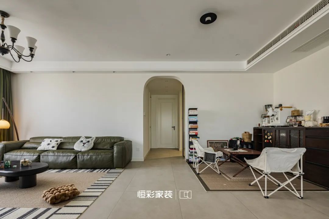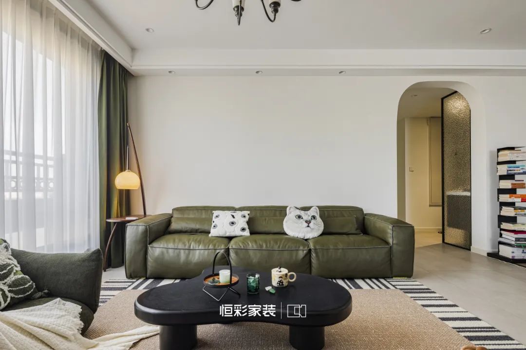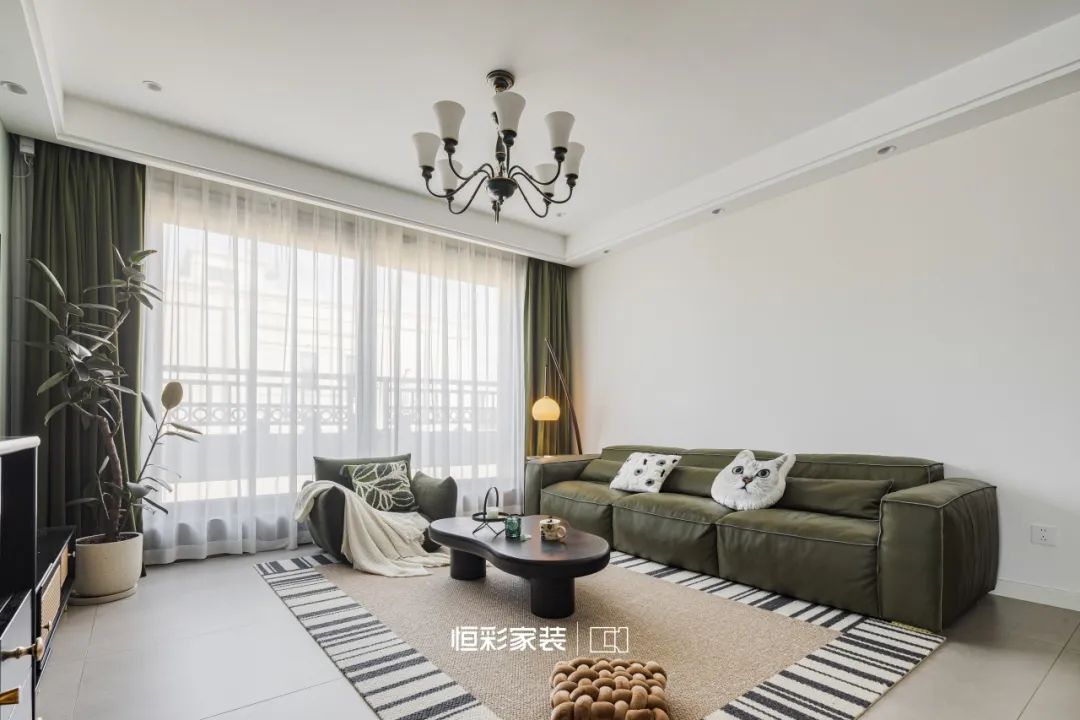 复古落地钓鱼灯光影绰约,时光的脚步轻轻掠过这片宁静,留下淡淡的法式韵味。大株绿植与深绿色窗帘相互映衬,将客厅装点成自然森林,时间似乎被施了魔法缓缓流淌。