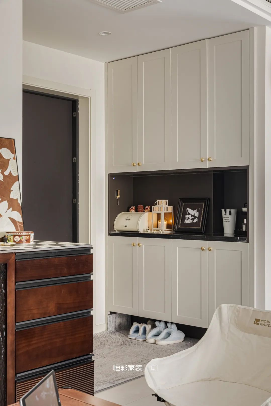 柜门轻启仿若翻开岁月的篇章,中间镂空处香薰轻烟缭绕,氤氲着淡淡香气。每一次归家都是一次心灵的旅行,时间似乎变得柔软,轻声低语。