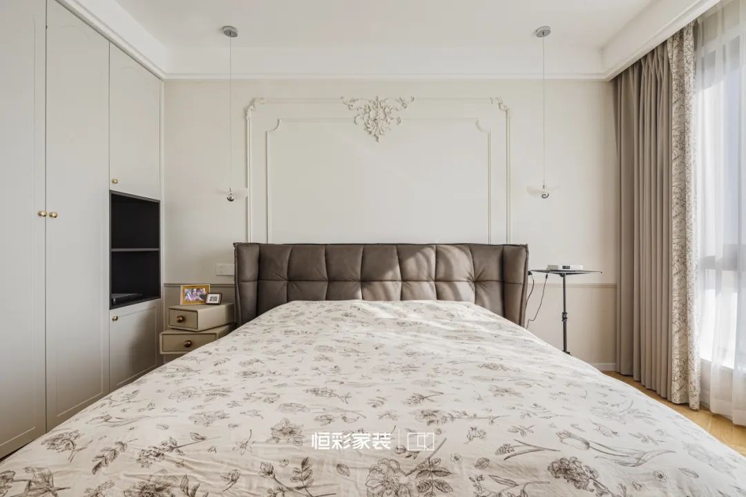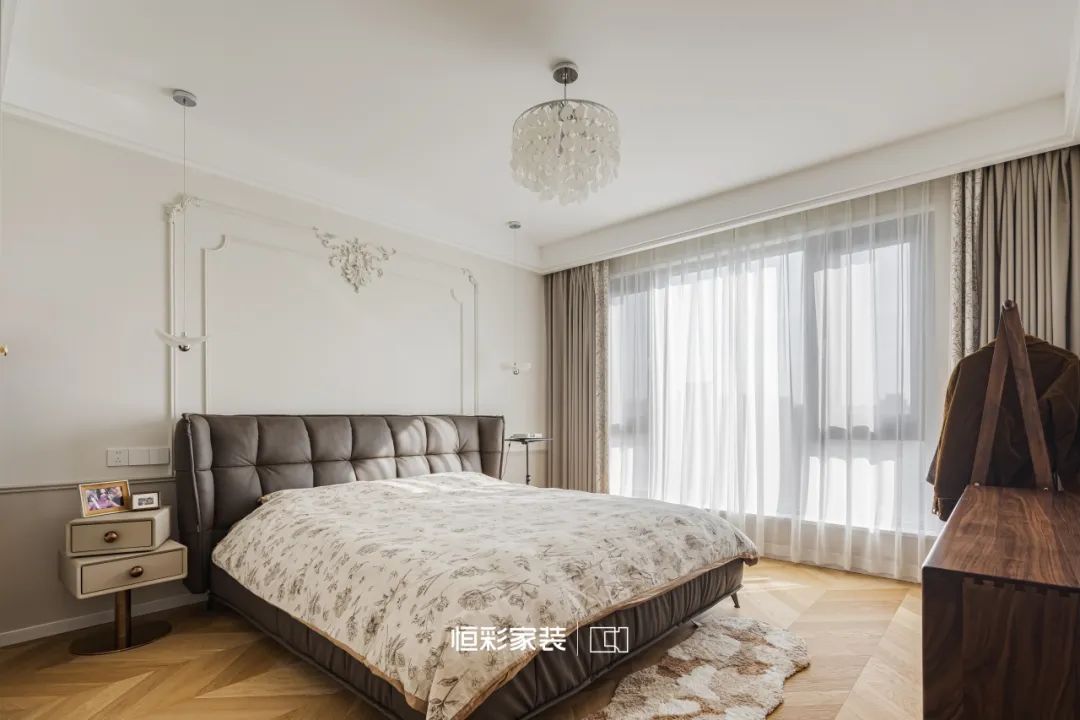米白乳胶漆墙面搭配法式石膏线,勾勒出主卧的高贵典雅,讲述着时间的年轮。人字拼木地板铺就出一曲岁月的赞歌,每一步踩踏似乎都能听到历史的回音。