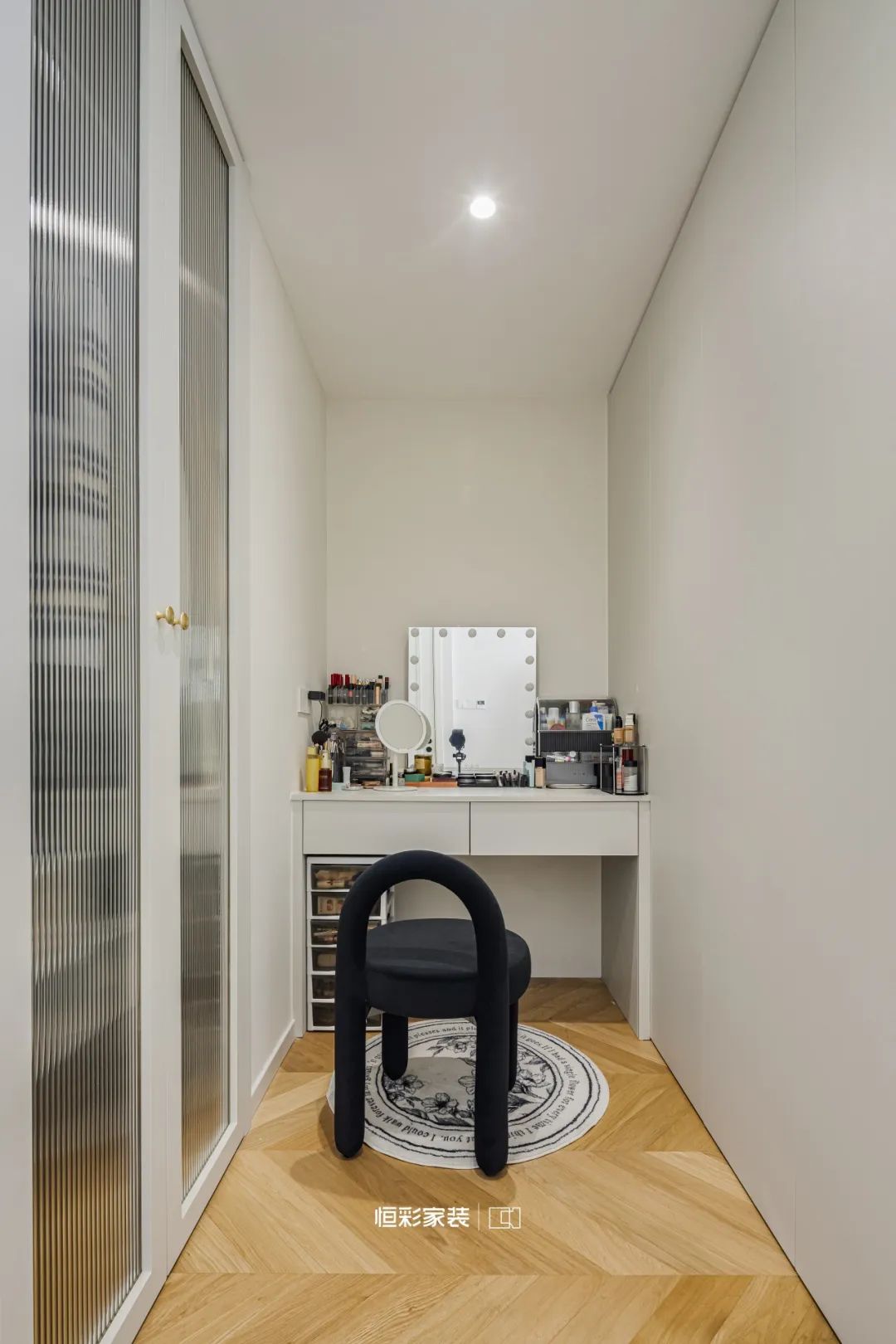 衣帽间白色梳妆台与黑色网红椅等待轻启,智能补光镜让每个清晨都充满美好和期待,精致的一天从这里开始。