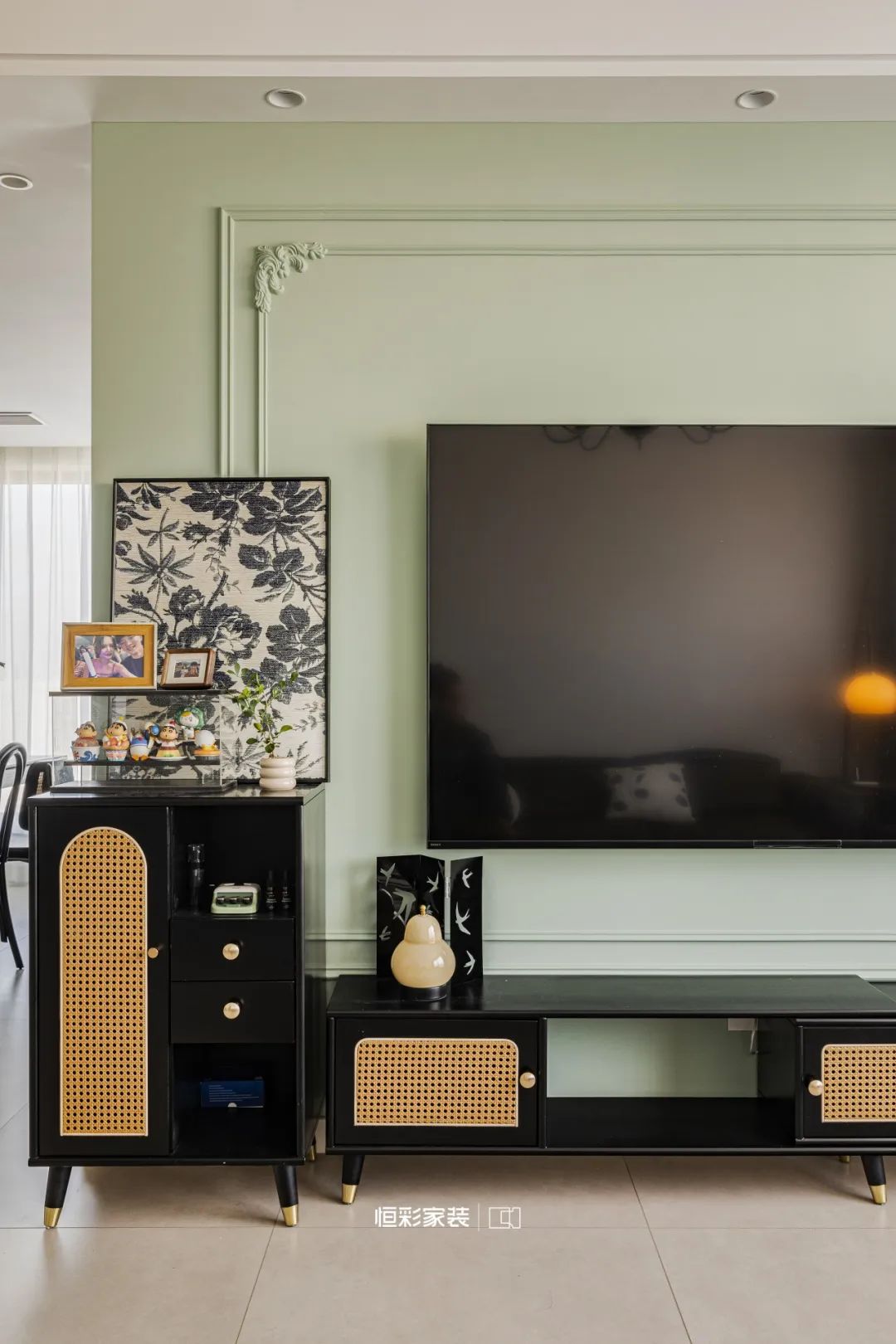 电视一侧黑色藤编电视柜与置物柜静默守候,它们在这片光影中低语,谱写出一曲恬静的二重奏。摆上业主钟爱的蜡笔小新手办,宛若一束阳光穿透时间的迷雾,注入一抹不经意的温馨。