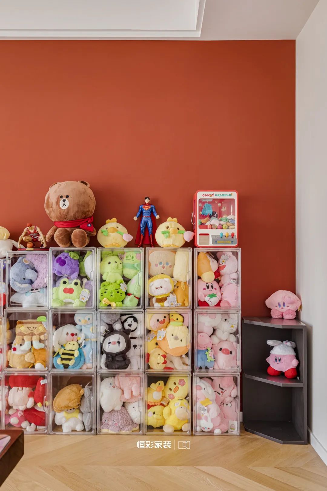 奶呼呼的粉色电脑仿佛少女心中的温柔梦境,惹人垂怜。一旁可爱的星之卡比玩偶简直萌化了~谁能拒绝整面墙的可爱玩偶呢?
