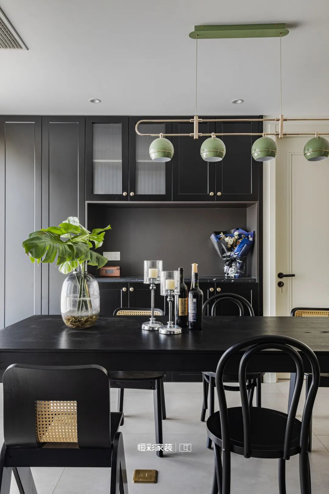 黑色餐桌椅靠窗而立,零星藤编元素与圆润拱形相映成趣,将混搭美学演绎得淋漓尽致。琉璃绿金吊灯静静垂挂在餐桌上方,复古的光泽增添了一抹古典奢华。