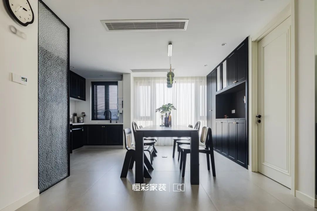 浓重的黑色餐边柜庄严肃穆,吟唱着法式浪漫。整面柜体让杂物都能找到归宿,尽显和谐秩序之美。阳光透过纱帘轻轻摇曳,诉说光与影的诗篇。
