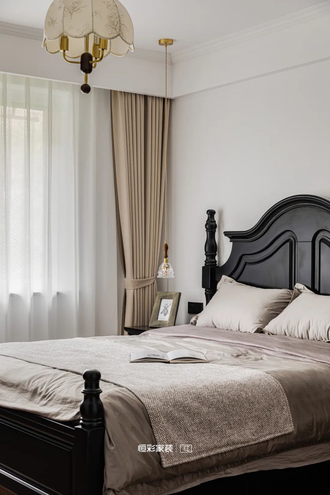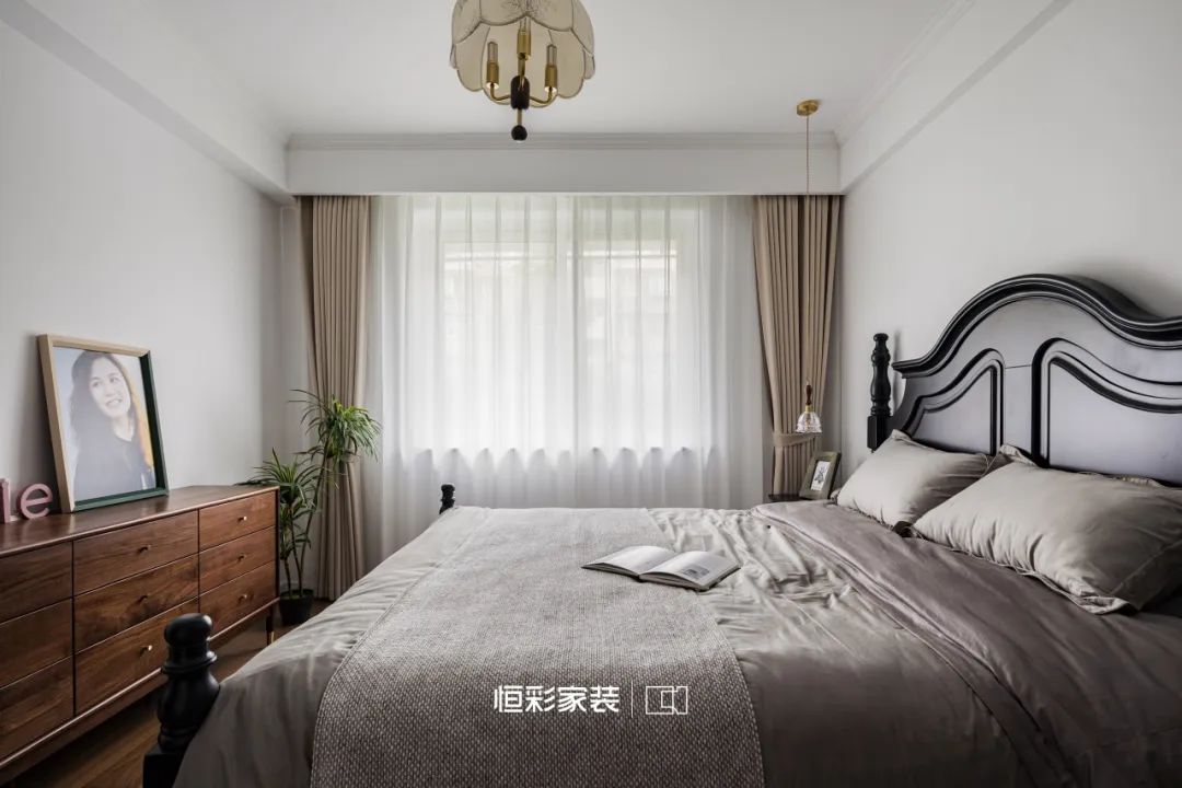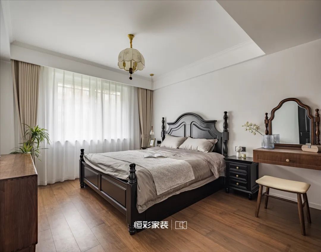 黑色实木床如光华流转的伴奏,彰显优雅矜贵。墙面刷上温暖的奶白色,恰到好处的浪漫,带来不言自明的温柔。复古花朵吊灯如时光追忆,在光影间闪烁。