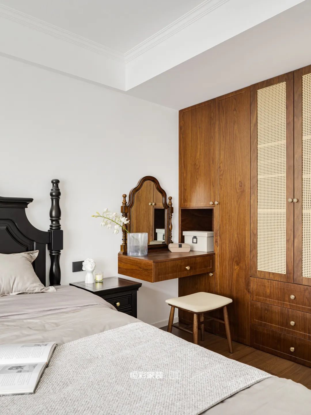 梳妆台溢出焦糖棕的温润,与衣柜一体的设计,恰似一场奇遇,极致收纳美学。