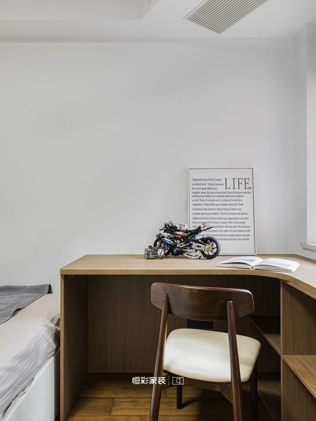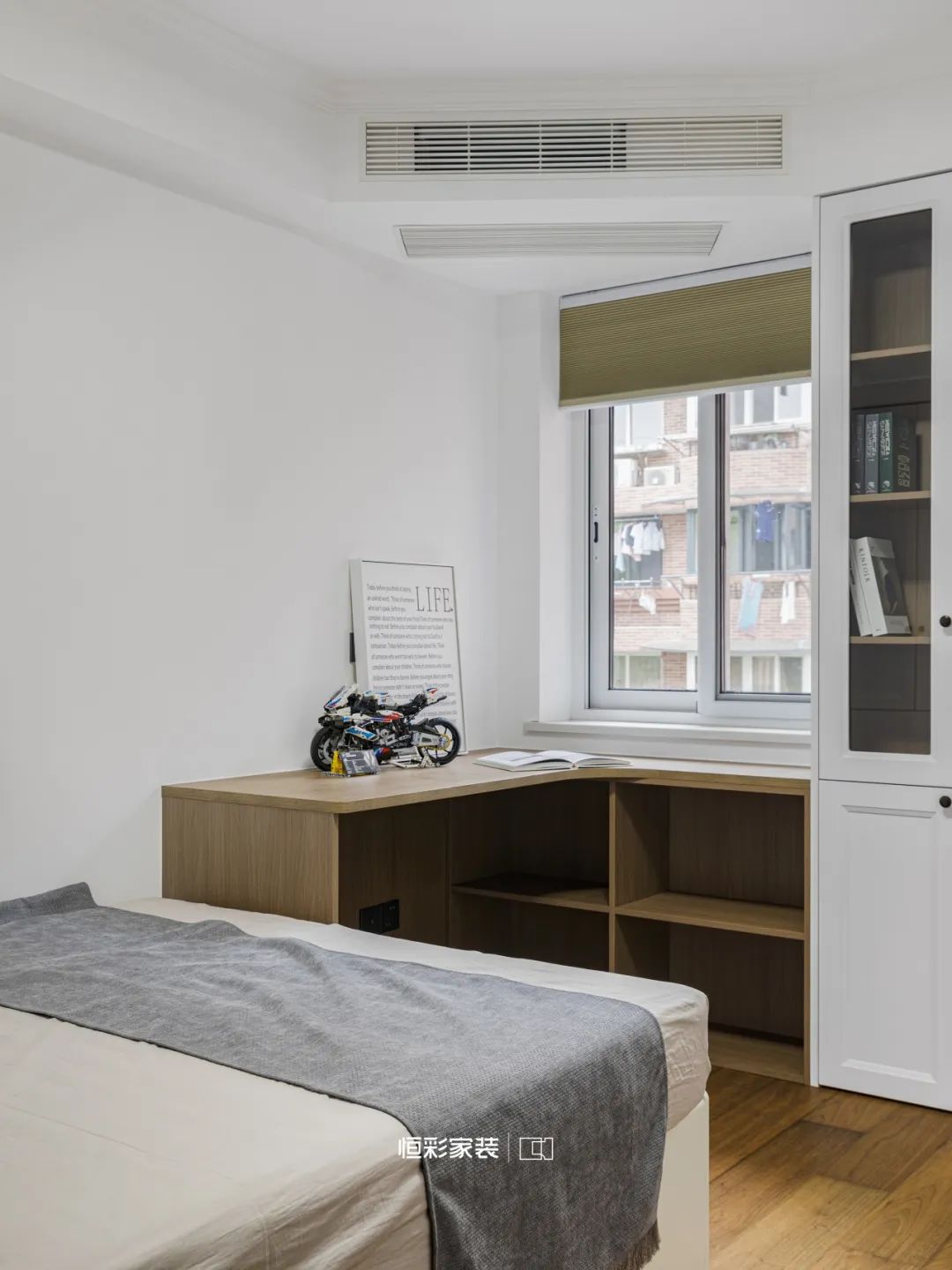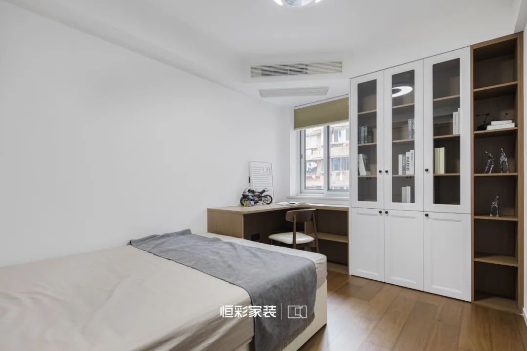 舍弃衣帽间,改以L型衣柜+梳妆台设计,让空间得以延伸。