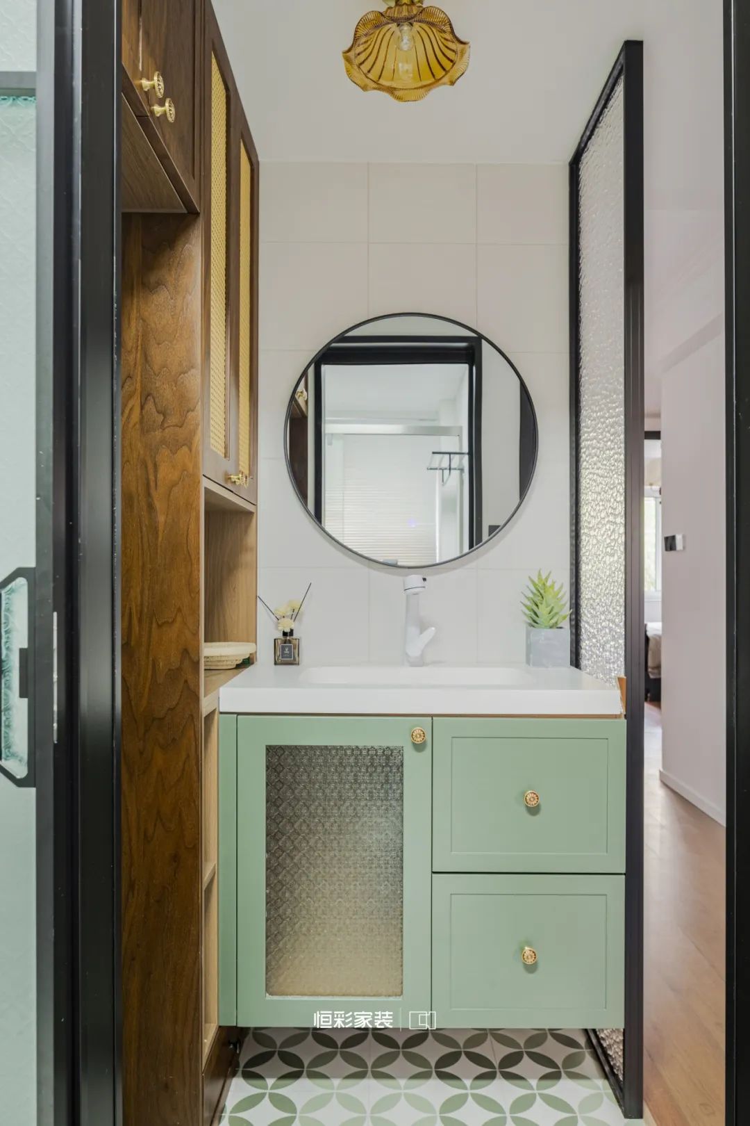 绿色浴室柜与金色复古吊灯交相辉映,仿佛时间的瑰宝,闪烁岁月的沉淀,映射光影的绝美。