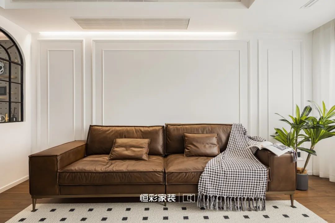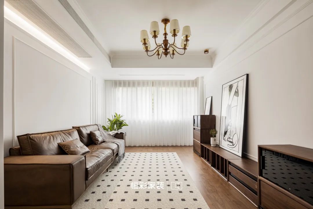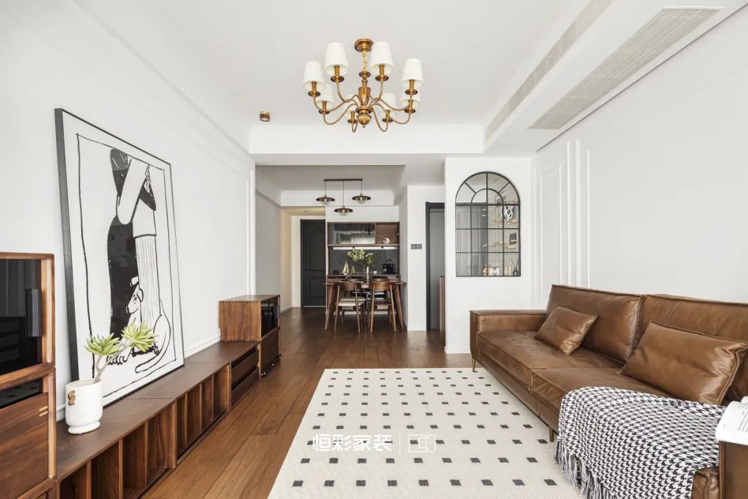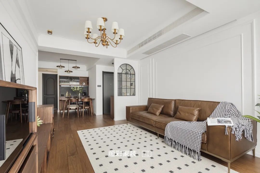 焦糖棕沙发好似岁月缩影,伫立时光中央。几何元素地毯随意铺展,却在不经意间,轻点每一道光影的舞动。胡桃木家具占据客厅边边角角,古老的故事娓娓道来。