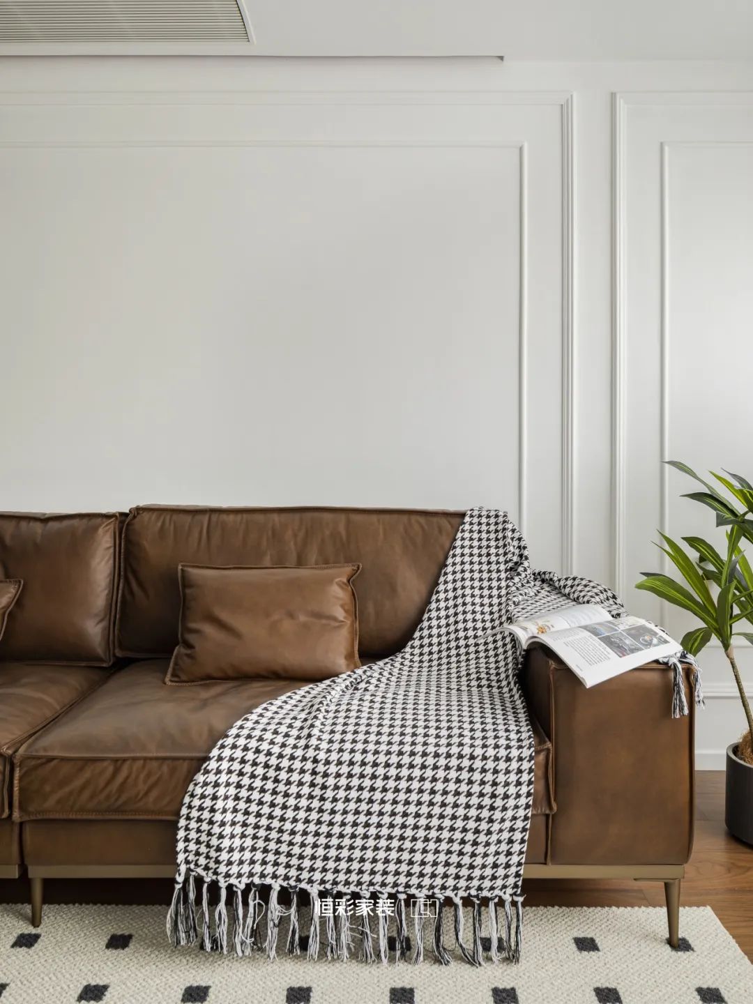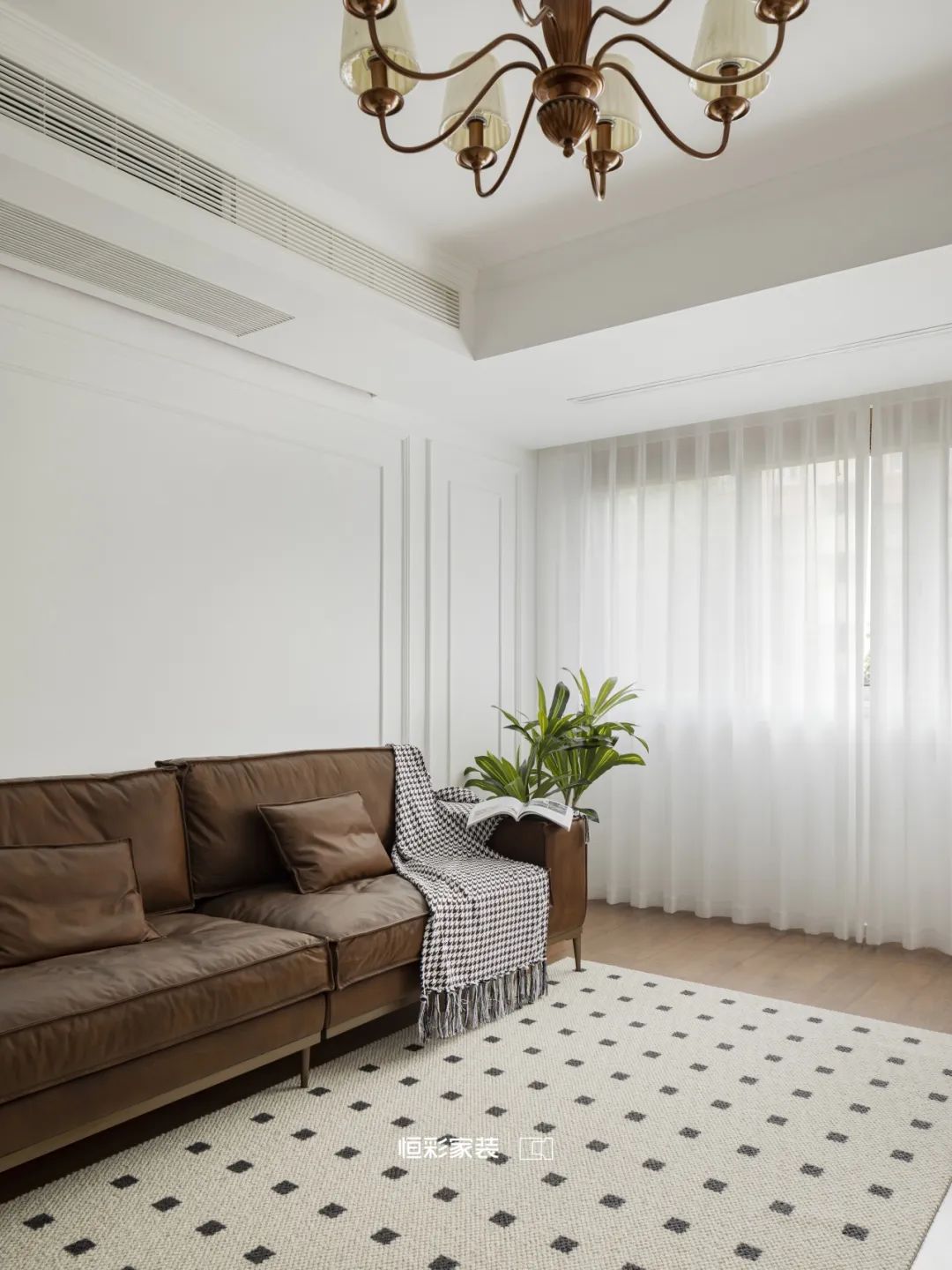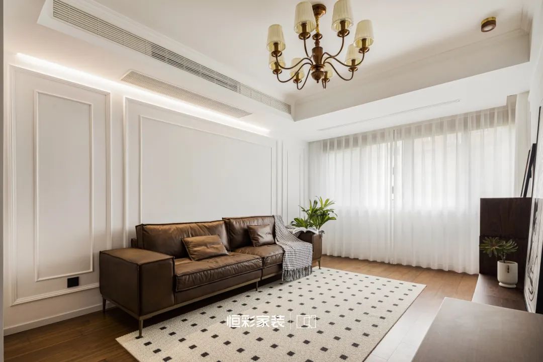 焦糖棕沙发好似岁月缩影,伫立时光中央。几何元素地毯随意铺展,却在不经意间,轻点每一道光影的舞动。胡桃木家具占据客厅边边角角,古老的故事娓娓道来。