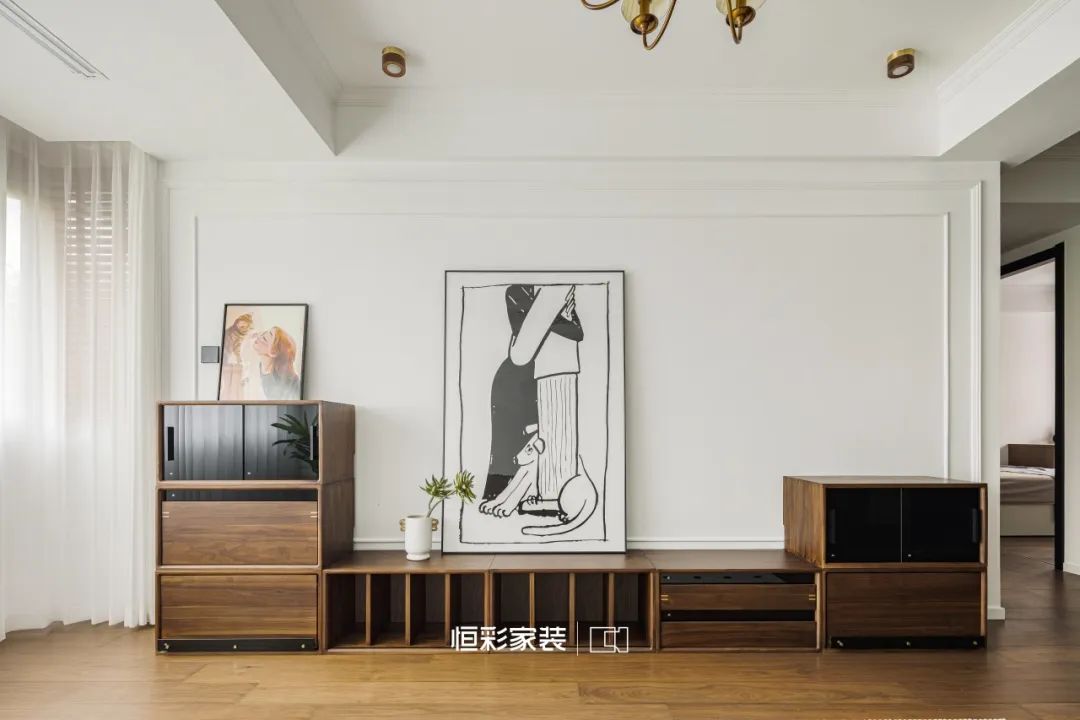 绿植摇曳,另添一分复古。从玄关到客餐厅,直至卧室,铺就一条温柔的光影之路,似在梦境漫步。眺望客厅,每一帧闪耀过往光影,书写电影般的迷离