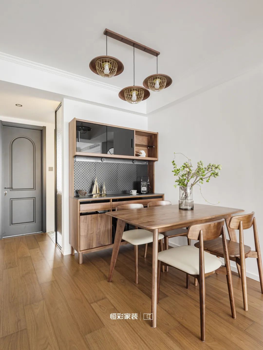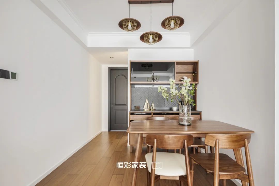 客餐厅将时光的界限轻柔抹去,复古焦糖色浸润这一方天地,餐边柜镌刻古老印记。实木餐桌椅沐浴在岁月的洗礼下,恍若梦境,时间绵长低语,积淀中古韵味。