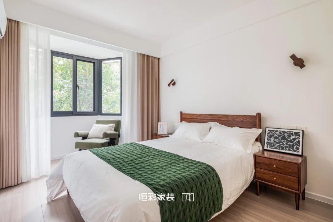 透过窗洞窥见淡烟疏雨、簪星曳月,只余最纯粹的致远。阳光透过窗隙洒落,似有似无,朦胧顿生。次卧似主卧般清冷纯净,心绪柔和成诗。