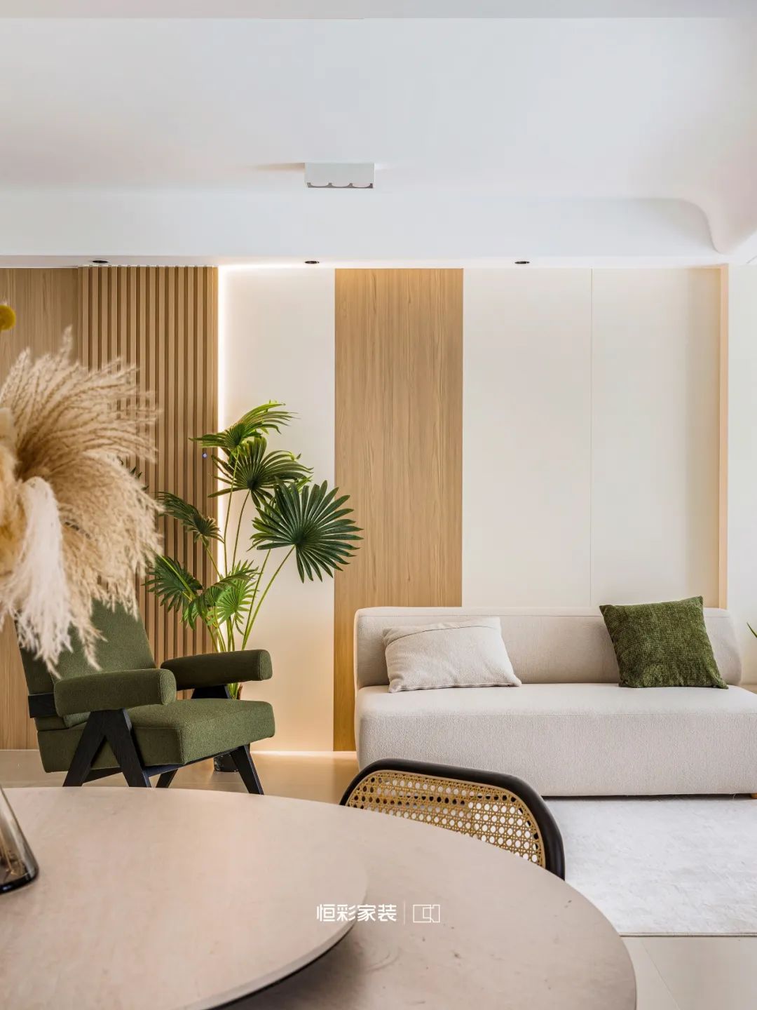高柜流光溢彩、错落有致,奶白柜门、原木柜体织就幽幽剪影,此时无声胜有声。芦苇干花仿佛一抹淡淡的晨光,唯美与柔和浓郁渲染开来。