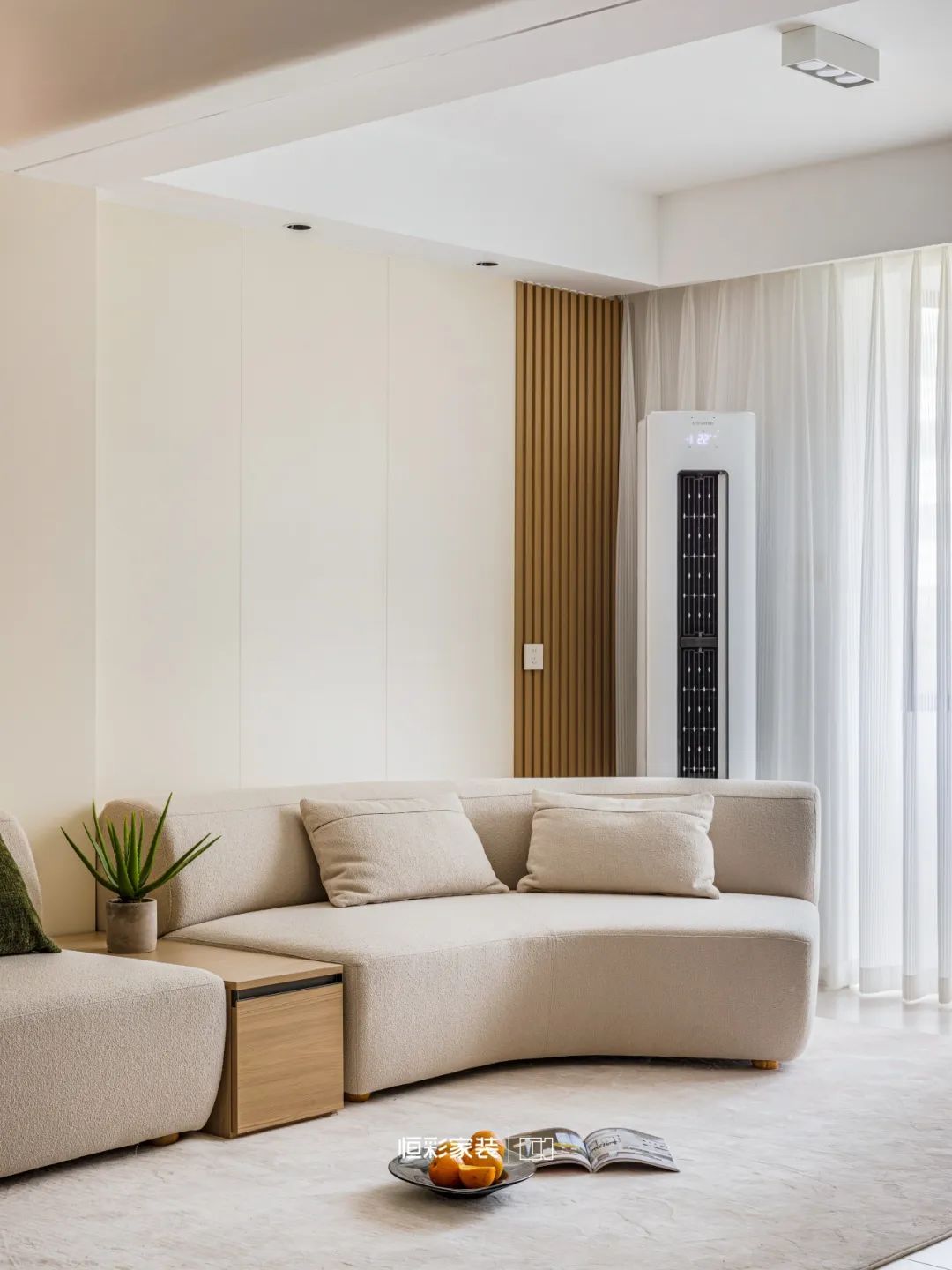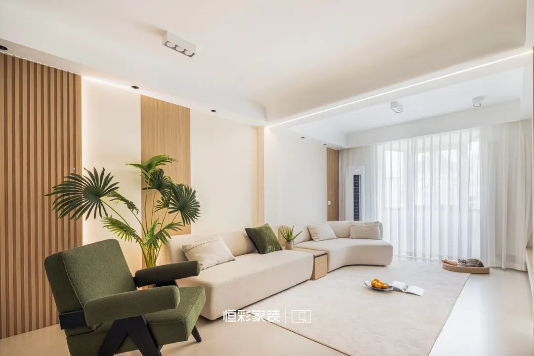 绿植将客厅装点成自然森林,像春天,像清晨,生机勃勃。几近落地的白纱在清风的轻抚下似云烟般轻盈飞舞,阳光正好时,每一寸都浸润在柔和光影里。