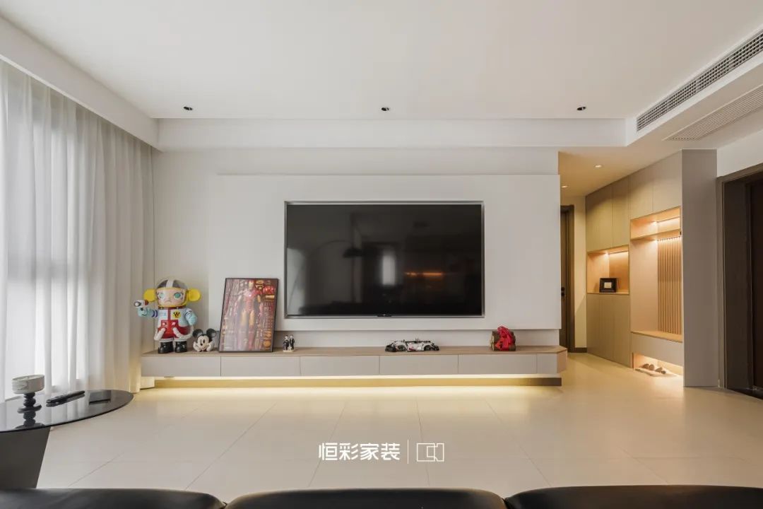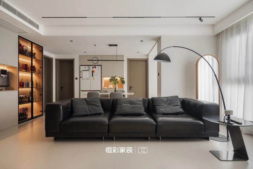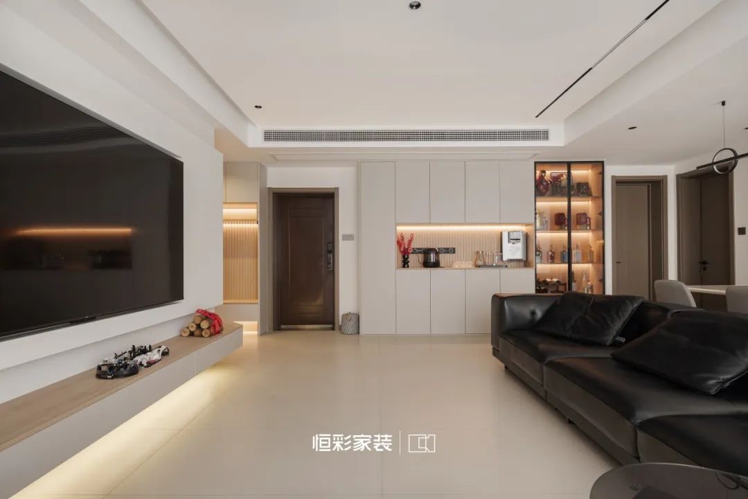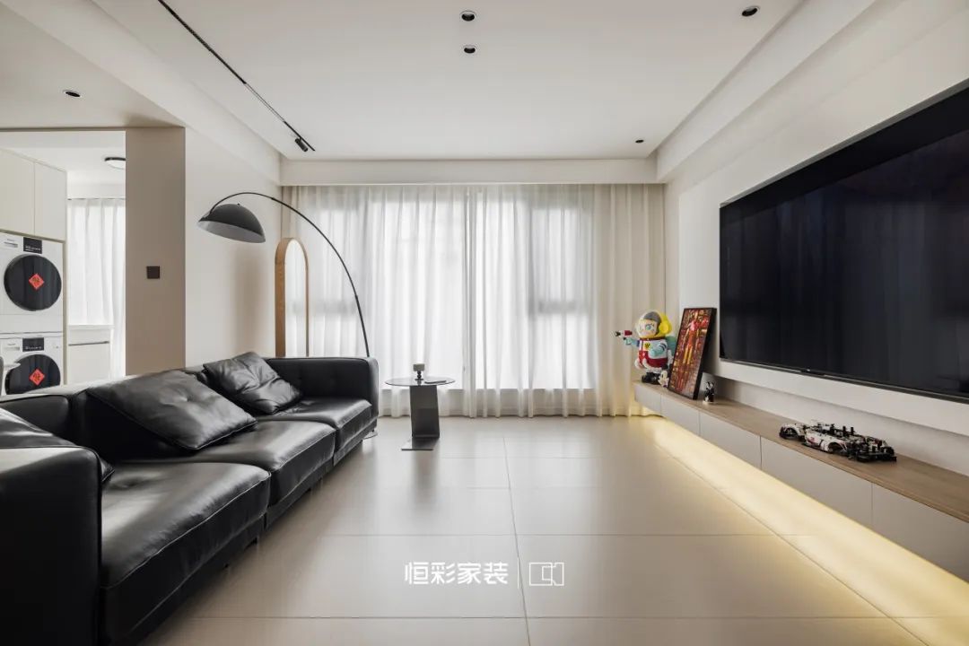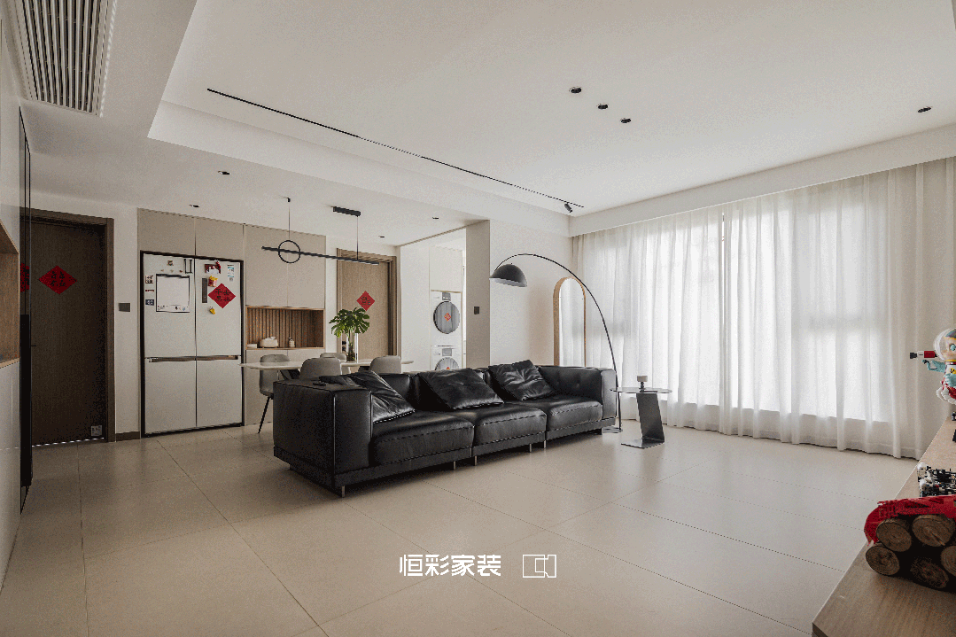 全屋在现代简约风的基础上统一奶油色调,重新调整布局后,扩大客厅空间,视野开阔。