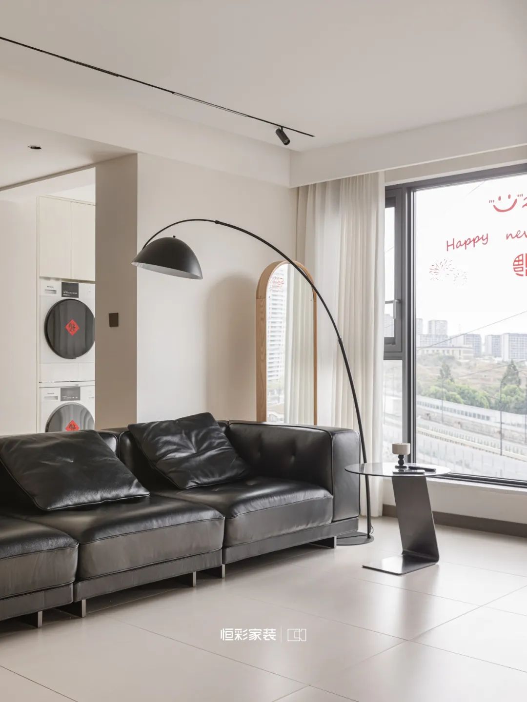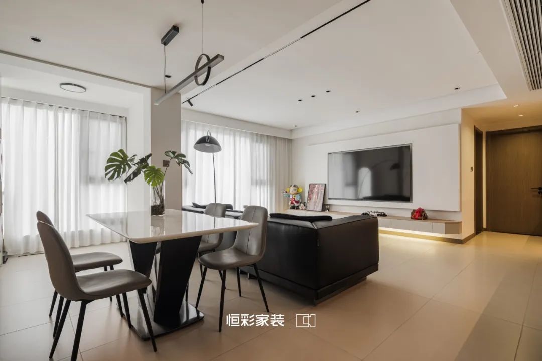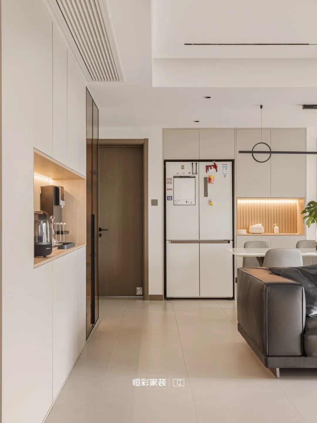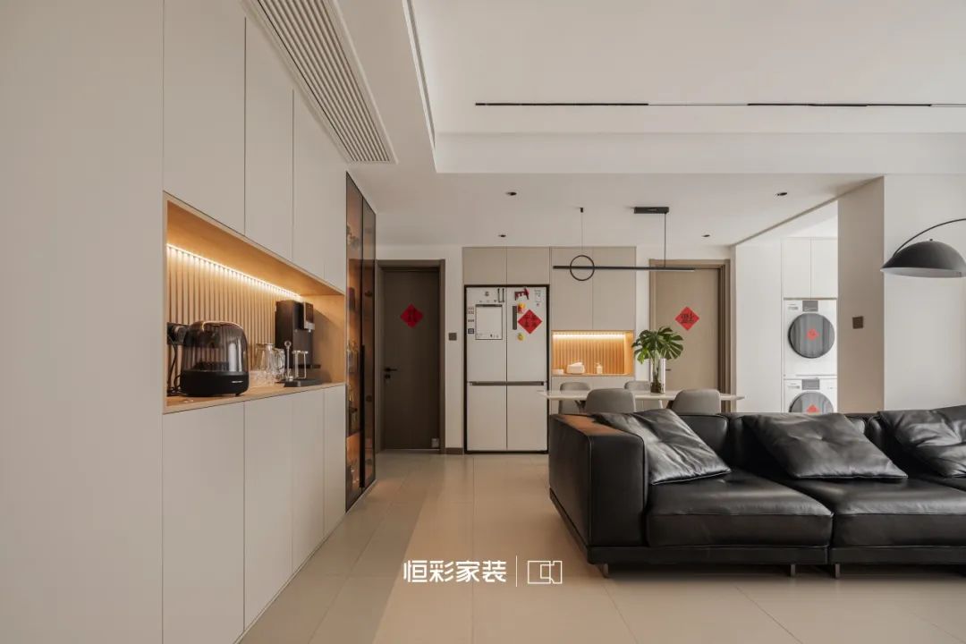 全屋在现代简约风的基础上统一奶油色调,重新调整布局后,扩大客厅空间,视野开阔。