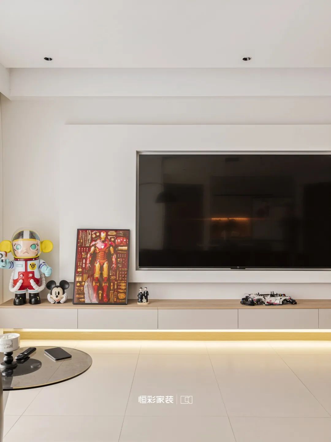 无主灯的空间,光影在磁吸轨道灯的引领下游离,时而闪烁,时而沉寂,述说一段未名奇迹。壁挂电视宛若一扇通向未知的窗口,透过它,似乎可以窥见远方的星辰。