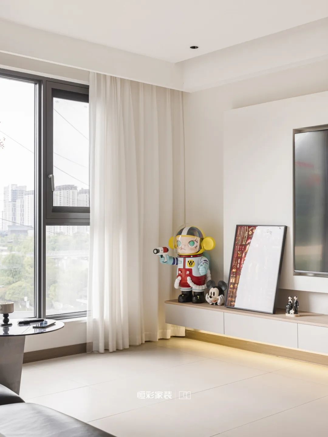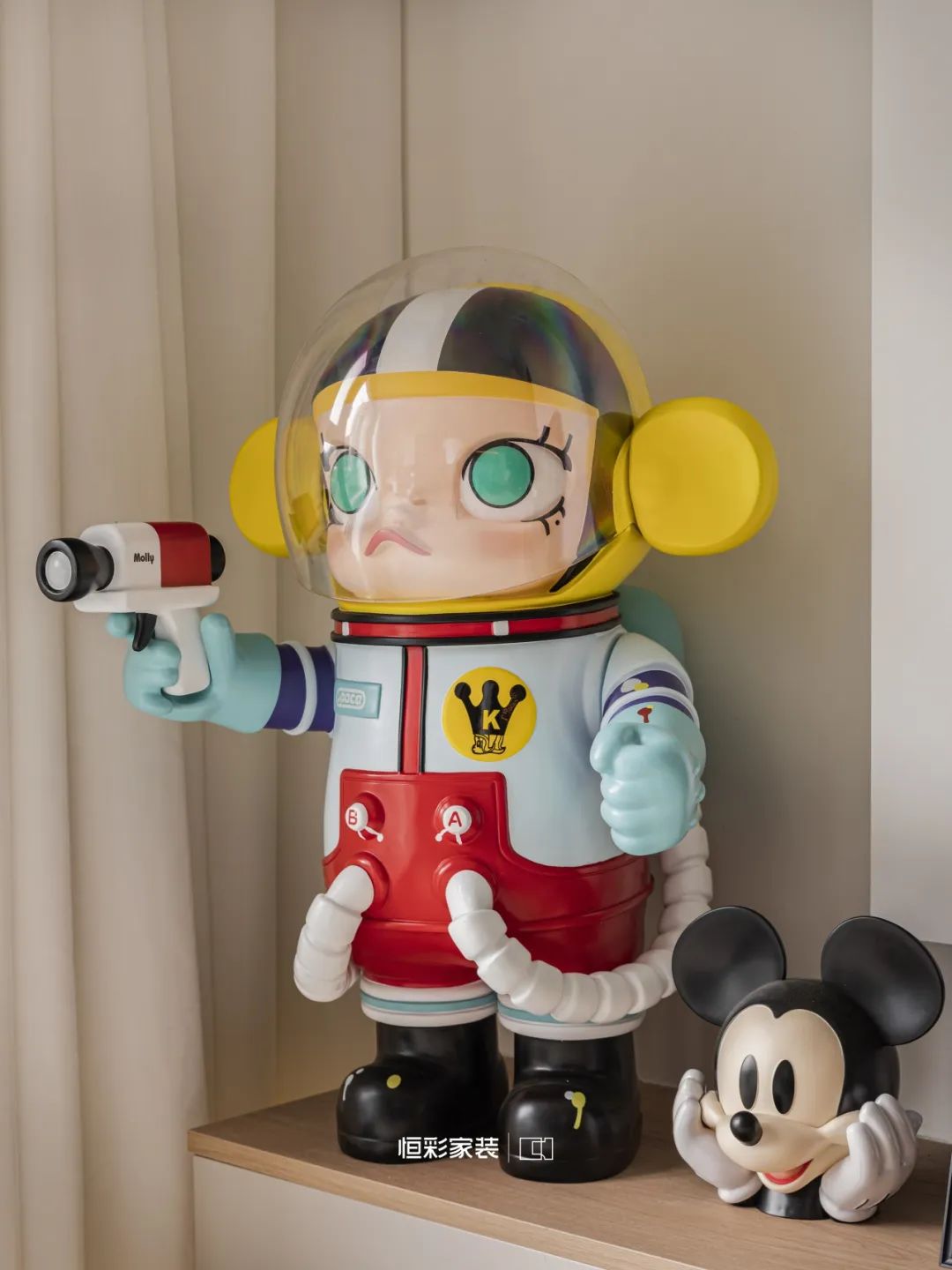沙发一侧落地灯带来几分柔和的光影,好似与时光共舞,开不开灯都很高级,泡泡玛特和各种手办的装点更是添了些许精致。