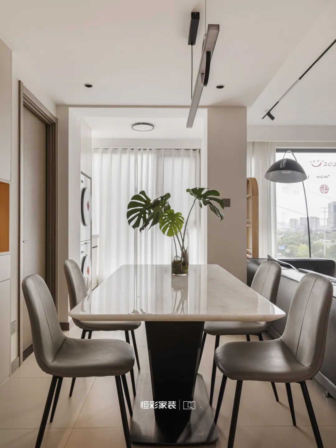 餐厅坐落窗边,每一笔都恰到好处,余晖洒落,轻轻涂抹便是绝色。艺术吊灯随夜色的涟漪轻扬,桌上绿植打破空间静谧,带来一抹跳脱的色彩。