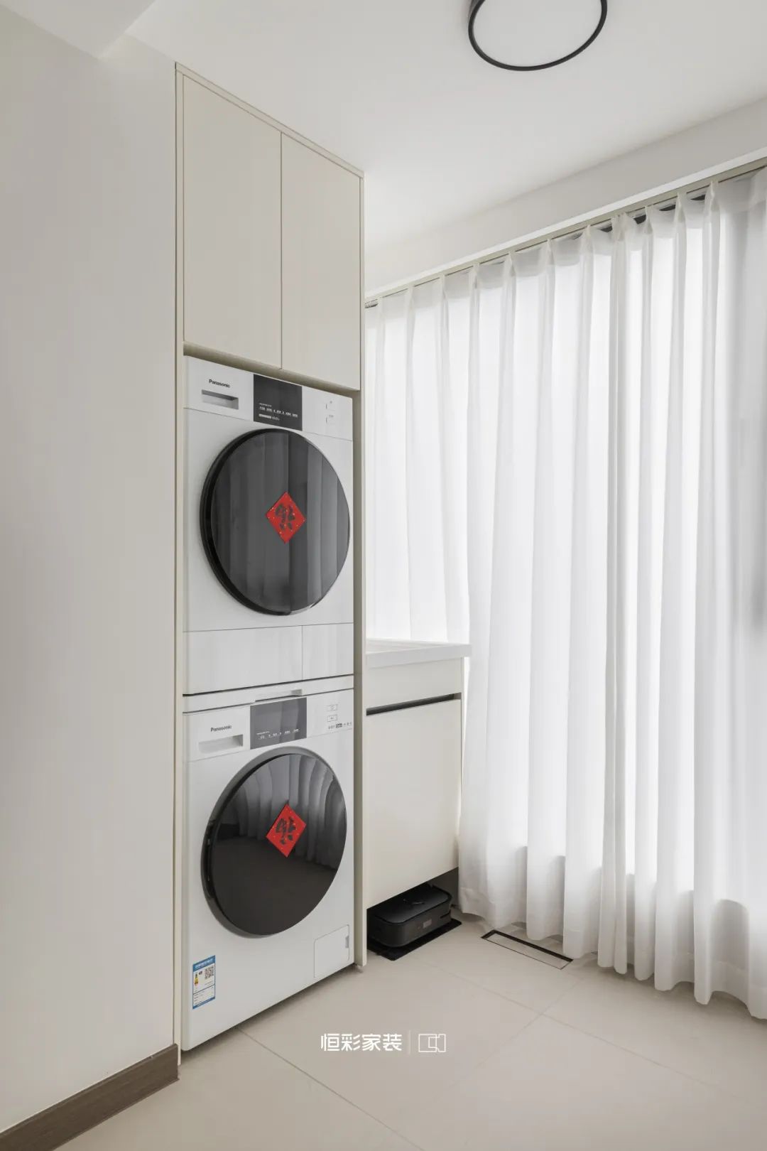 阳台与餐厅相通,放置洗衣机烘干机,顶部阳台柜,预留窗帘防止暴晒,阳台功能多却丝毫不杂乱。