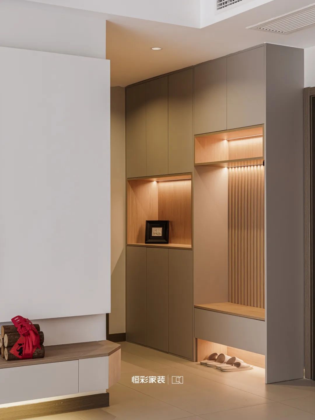 家门轻启,木色玄关柜在曙光中若即若离,轻柔迎接归来的旅人,填补空间留白。镂空处似在酝酿一场不期而遇的惊喜,银河灯带如月光洒落,镀上一层金色光辉。