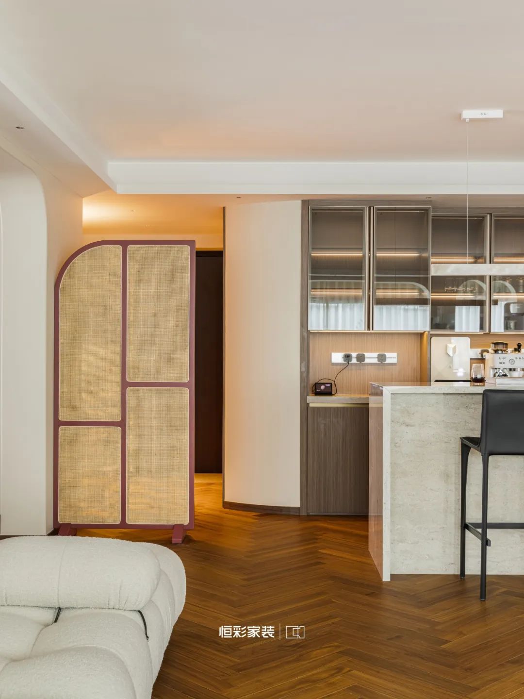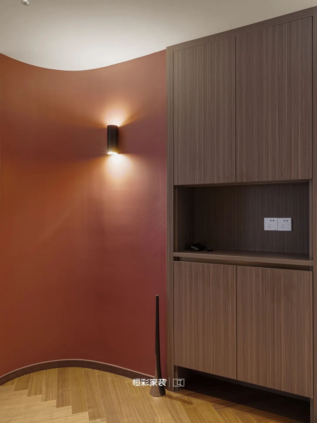 红色乳胶漆温暖归家的视线,朦胧美丽,精致的弧形柔和中带着几分恰到好处的圆润,步步清风,悠悠入梦。藤编屏风半遮半掩间将神秘的流光细细描绘,久久不散。
