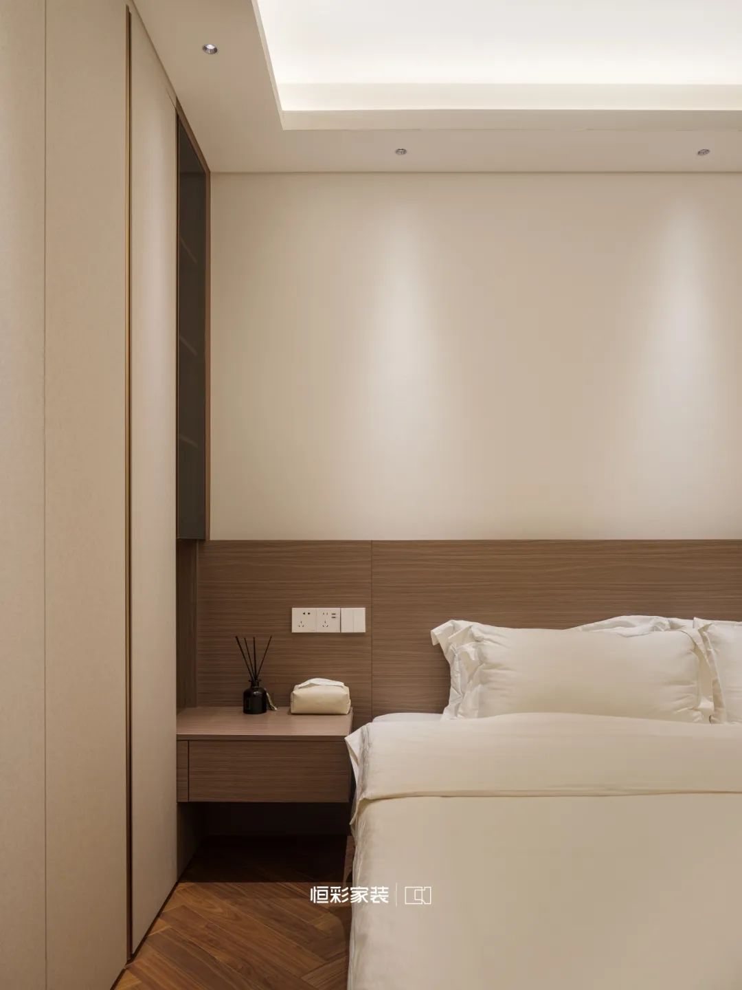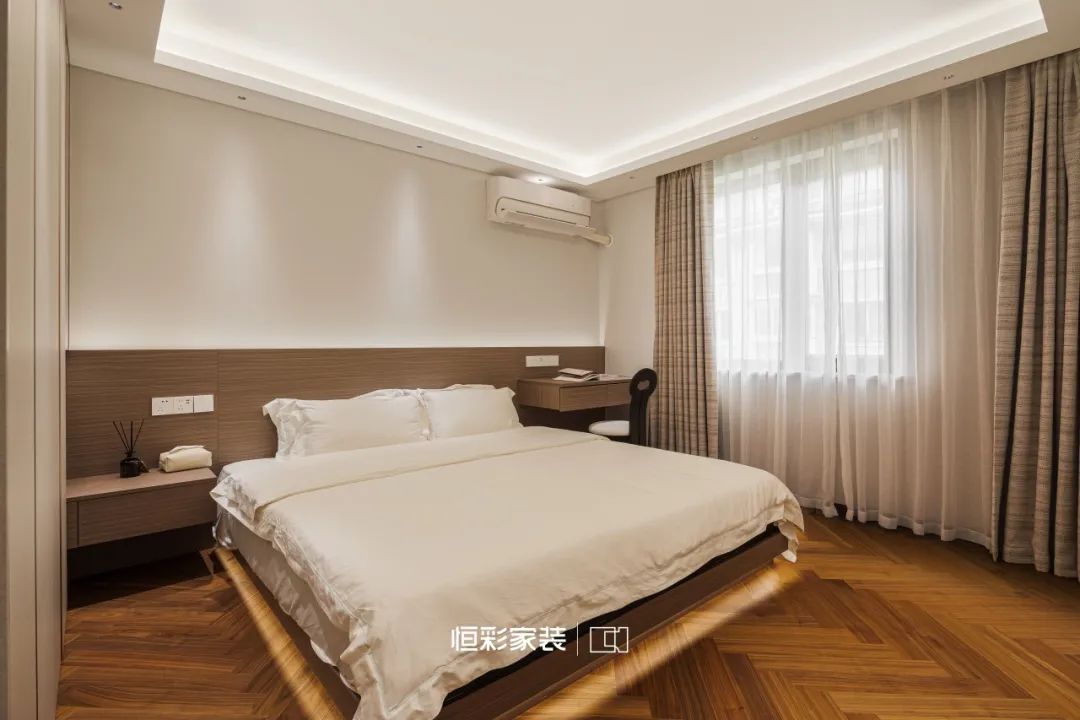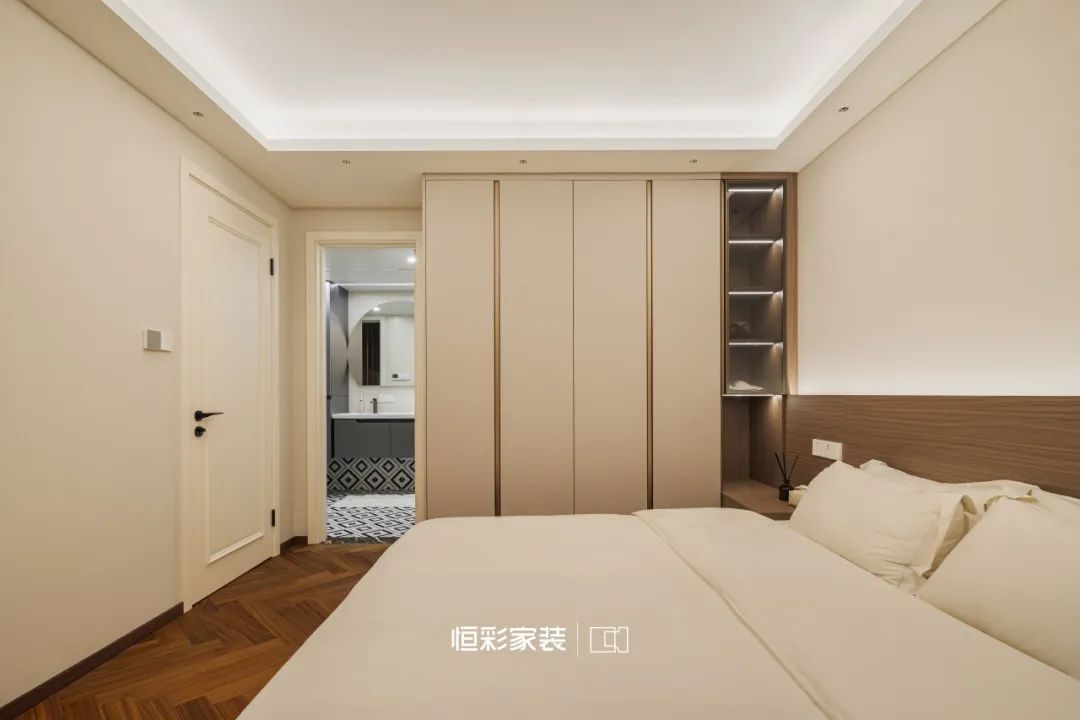 焦糖色木地板铺就出一曲岁月的赞歌,这颜值不要太好看,中古氛围全部拿捏!床头柜与衣柜一体,在光影中轻抚岁月痕迹,不言不语,却满含情意。