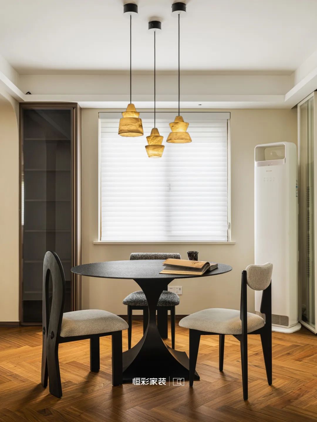 三盏吊灯似夜空中的星辰静静垂挂餐桌上方,点缀一抹无尽的中古浪漫,编织梦境绚烂,夜暗方显万颗星,灯明始见一缕尘。
