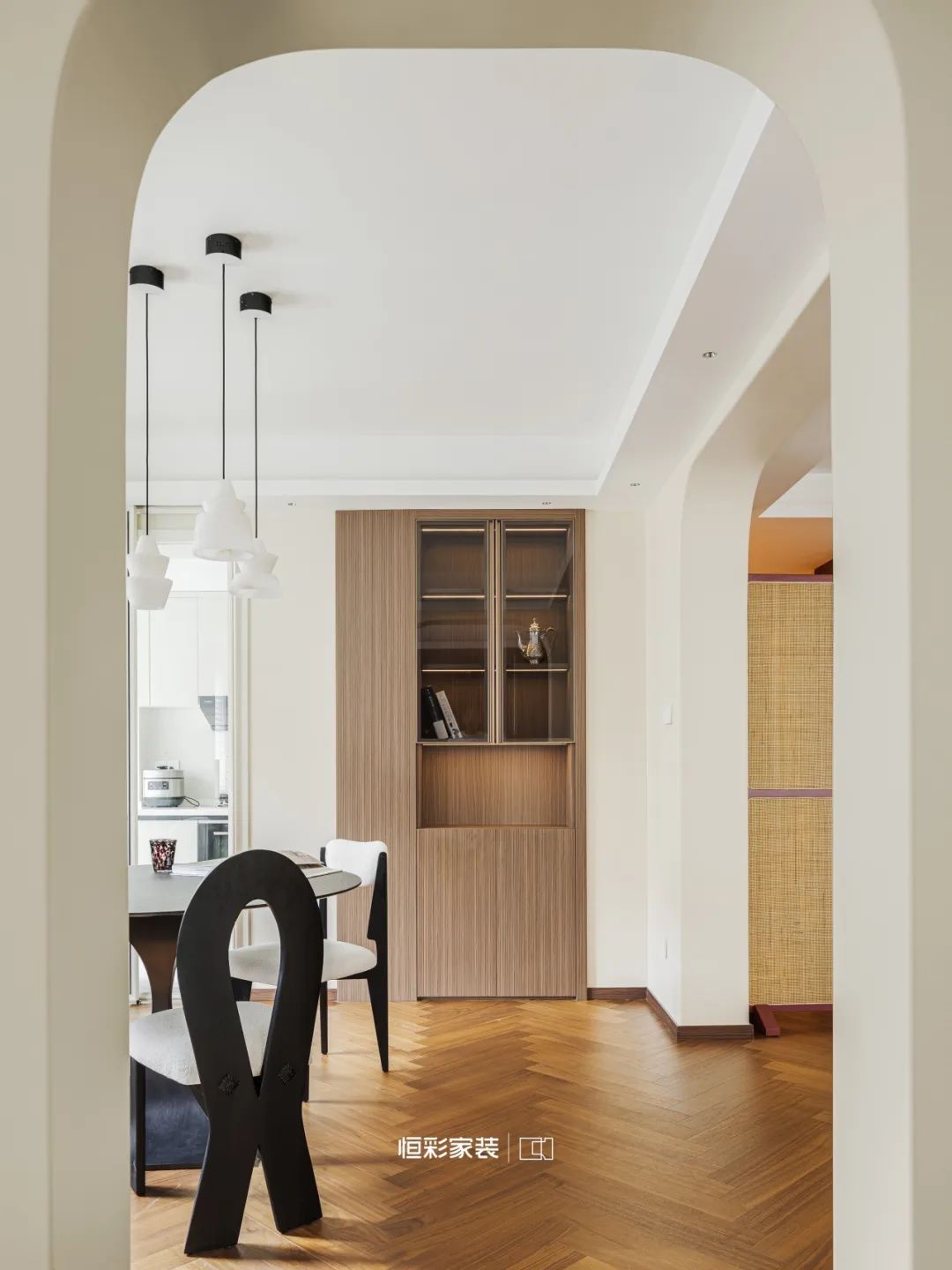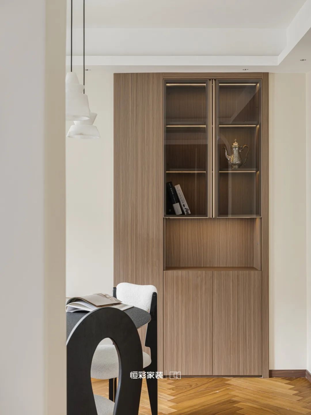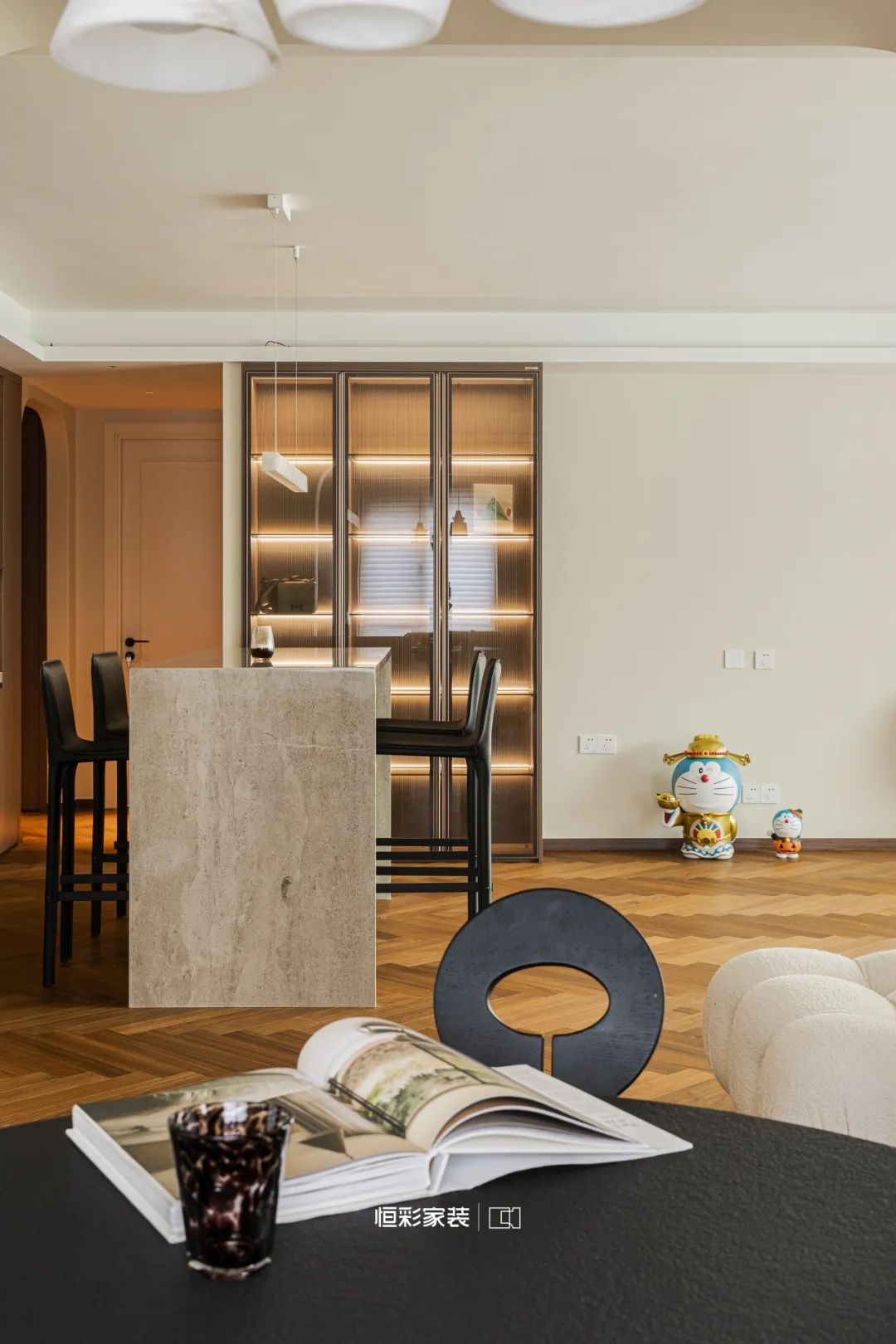 岛台将时光的界限轻柔抹去,玻璃柜门、原木柜体织就幽幽剪影,眺望餐厅,每一帧闪耀过往光影,书写电影般的迷离。