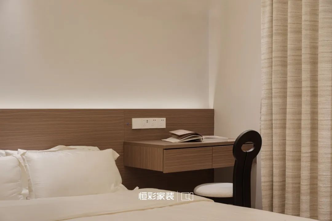 靠墙整面衣柜不仅收纳着生活的琐碎,纯净的米白更是增添了几分治愈。奶油感满满的床品、复古窗帘,每个角落都流露出温柔的中古风情。