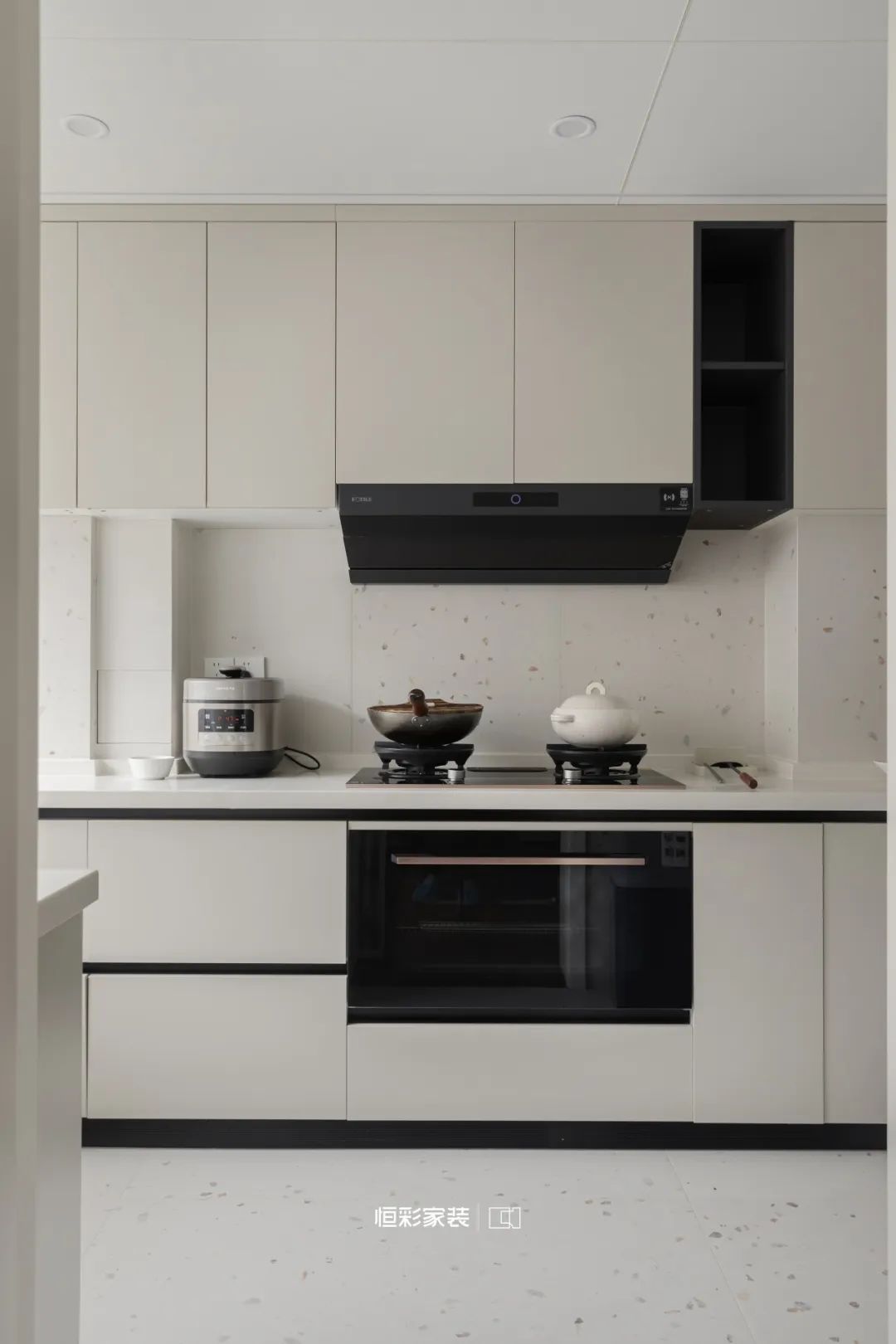 厨房U型布局,纯白台面仿佛是天边流云的一角,黑色电器点缀其间,宛若天成。米白橱柜温柔雅致,奶呼呼的令人心动。