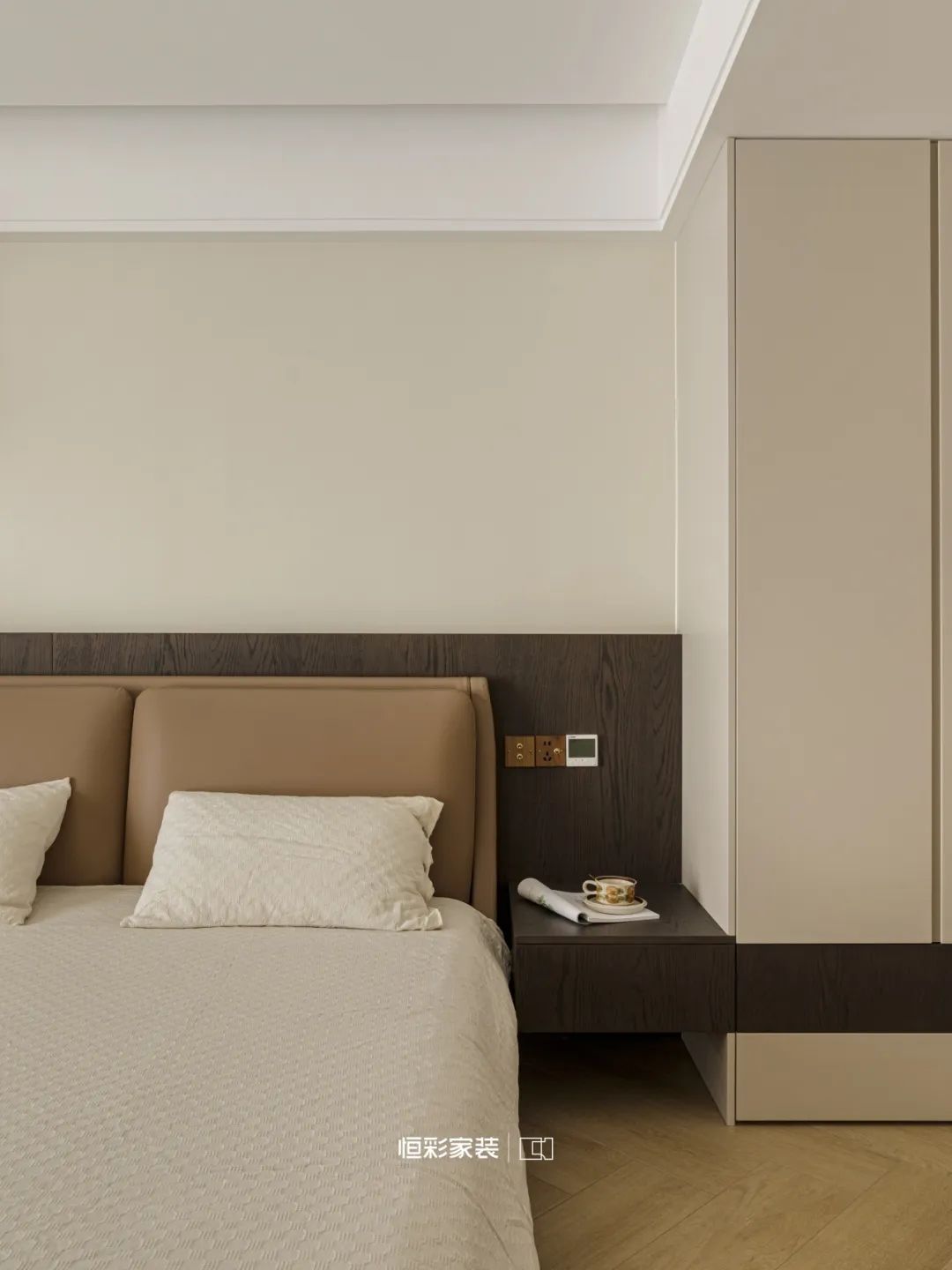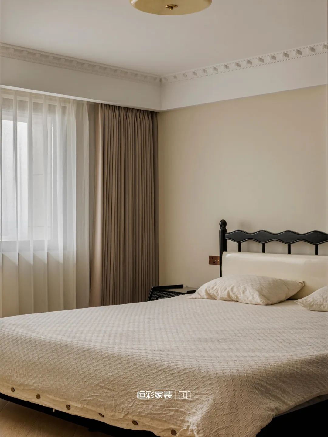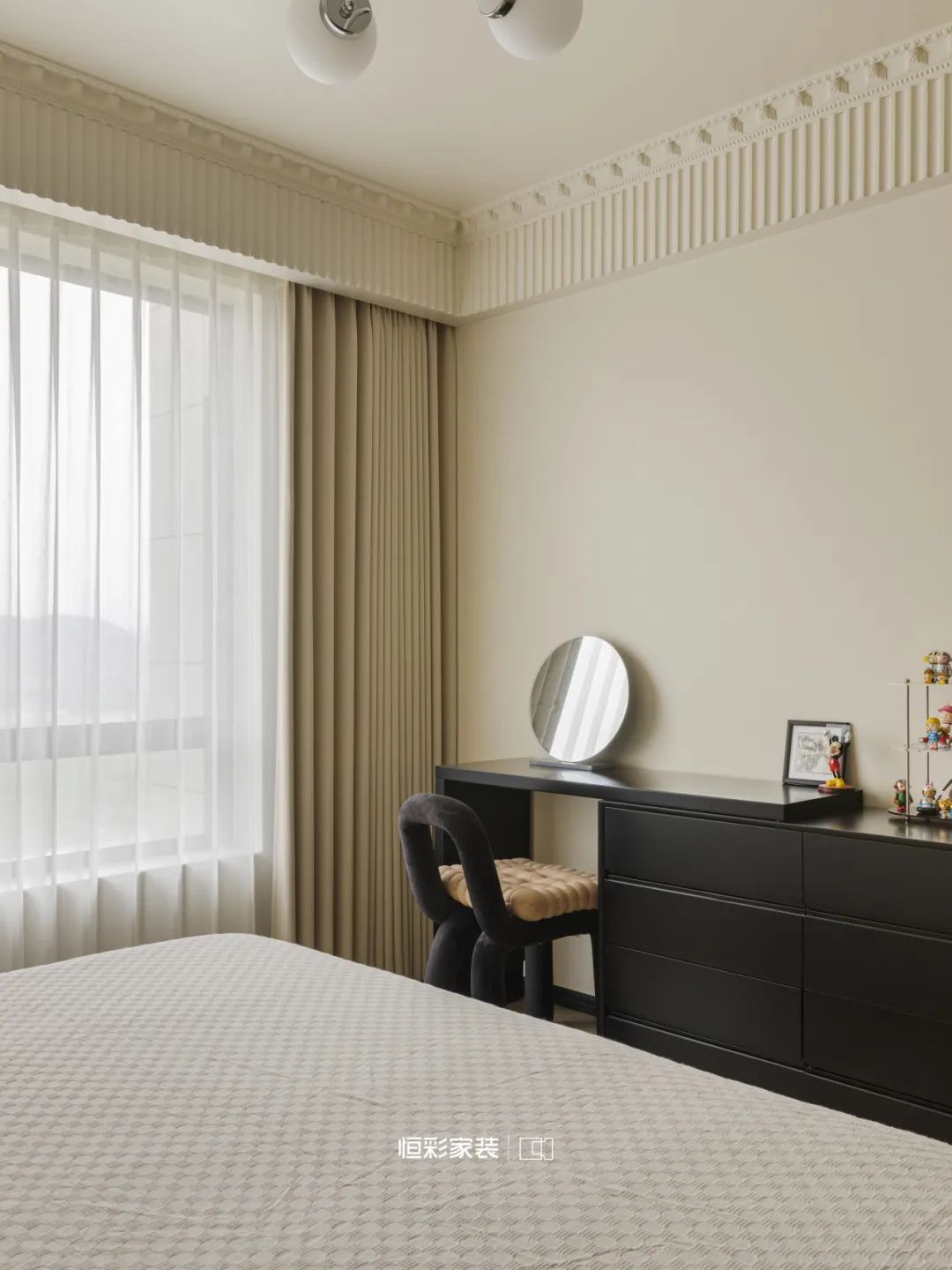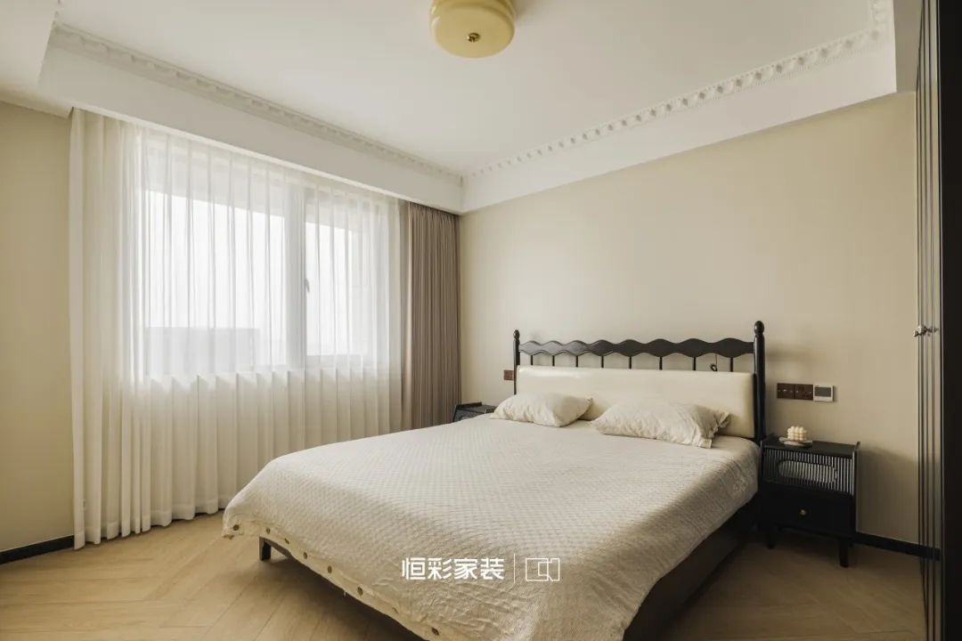 奶油感满满的床品、复古窗帘,每个角落都流露出温柔的浪漫风情。一侧衣柜轮廓深邃,虚实间勾勒出梦的边缘。焦糖色木地板,这颜值不要太好看,奶油氛围全部拿捏!