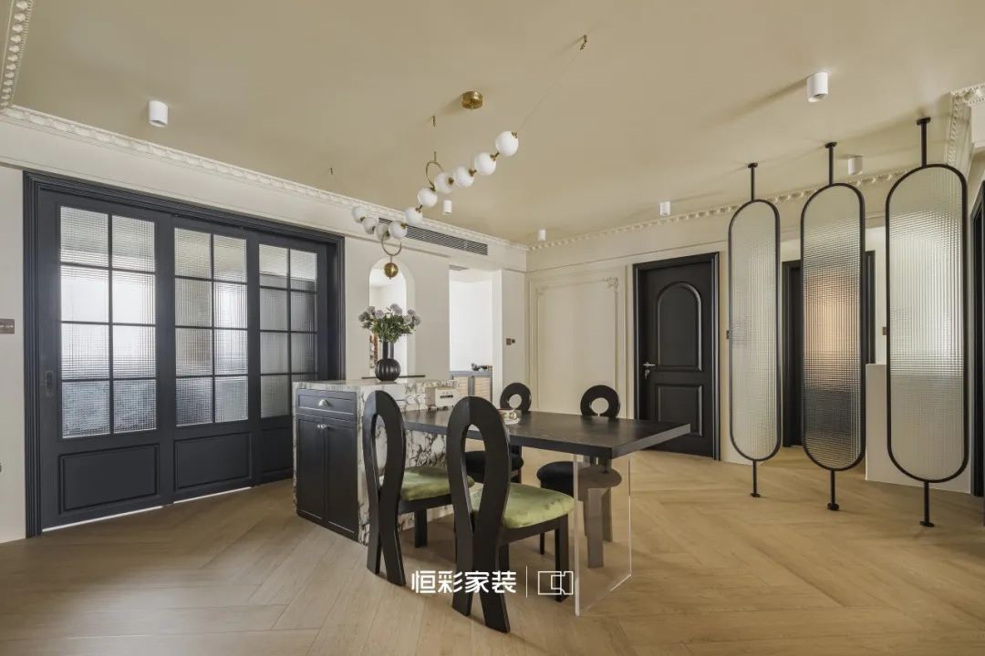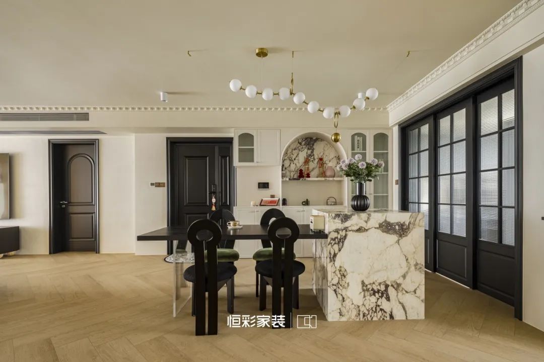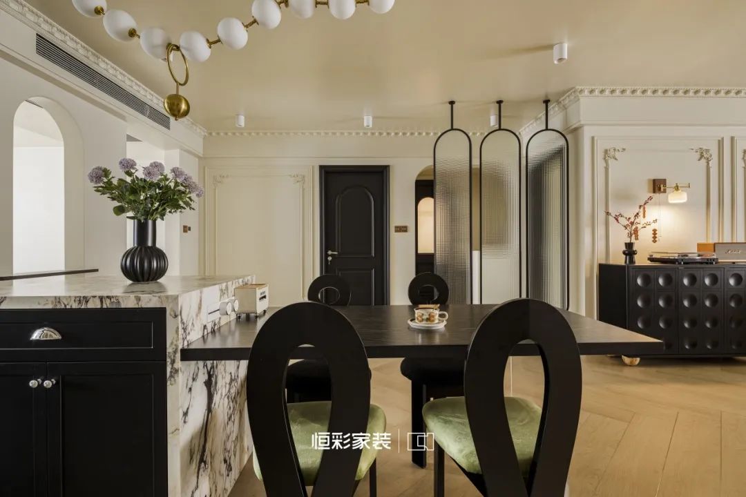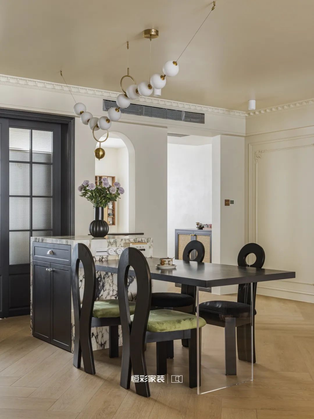餐厅宛若一幅泼墨山水,仿佛能听到墨色在宣纸上缓缓渲染的声音。黑白色彩纯粹,大胆挥洒出一幅法式与古典交融的写意画卷。