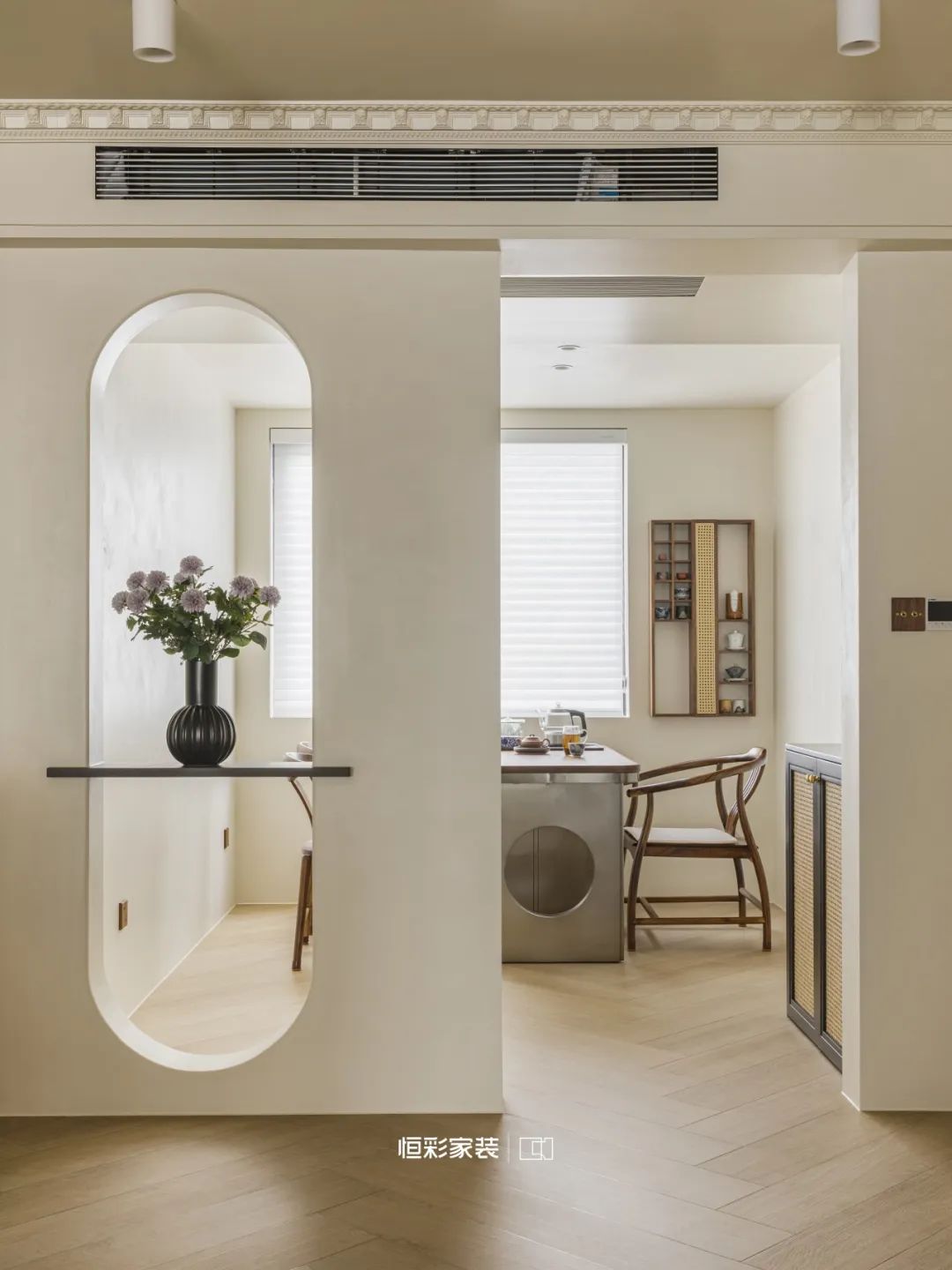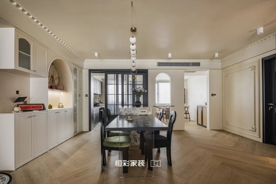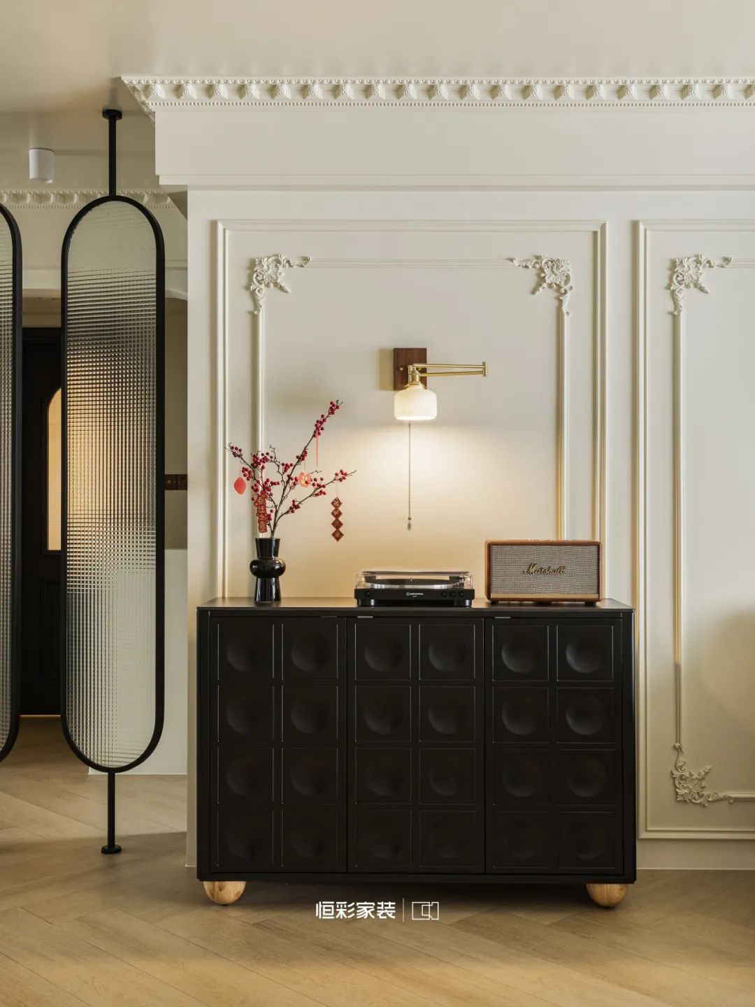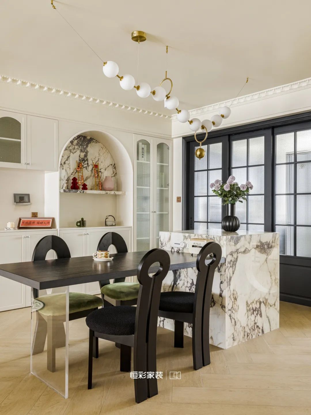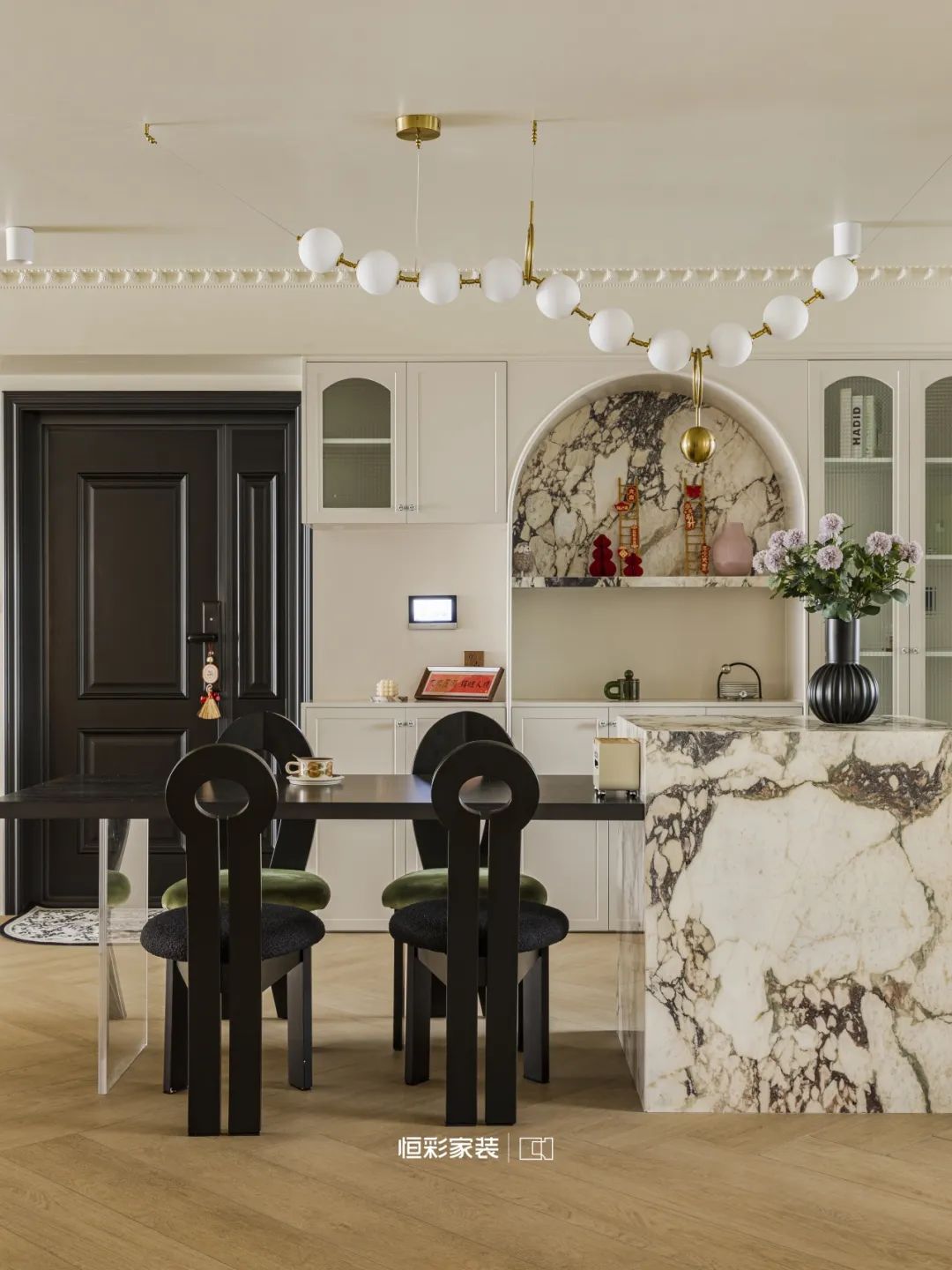 奶油白餐边柜宛若一块甜甜的奶油蛋糕,错落有致的摆件其间婀娜流转,眺望餐厅,每一帧闪耀过往光影,书写电影般的迷离。