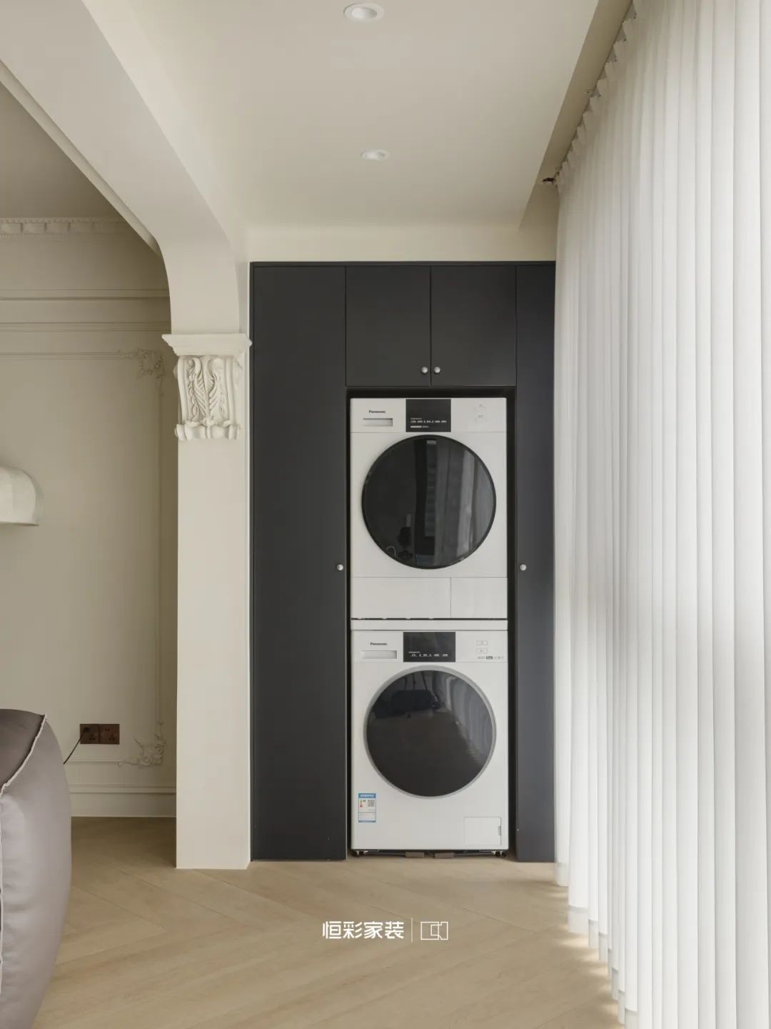 客厅次卧与阳台相通,一侧洗衣机烘干机,黑色阳台柜纯粹至美,白纱轻扬,这是家中一处模糊时间界限的角落,似虚似实。