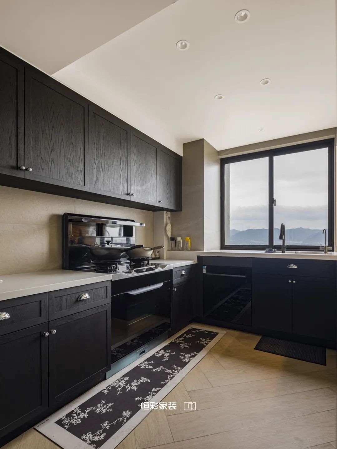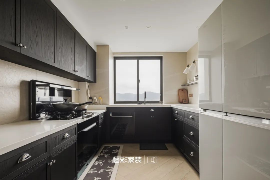 纯白台面奶呼呼的令人心动,厨房U型台面,白与黑好似画家的调色板,宛若天成刚柔并济,黑色橱柜如远山剪影般沉稳内敛。