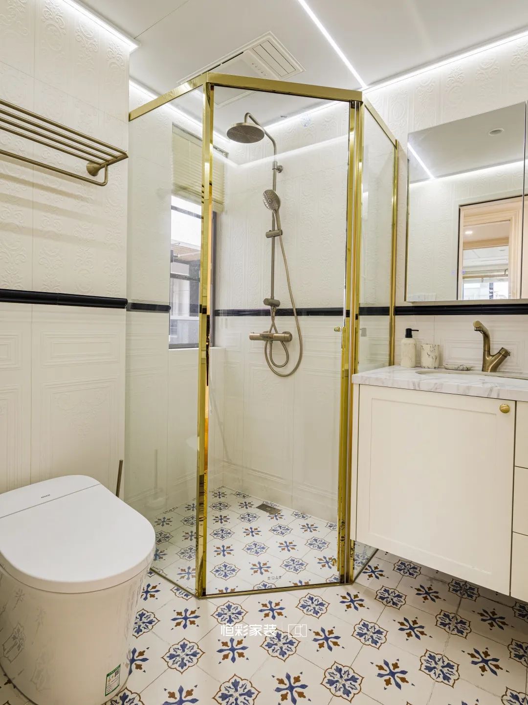 新家两个卫生间化身艺术角落,复古花砖清新脱俗,白金好似从自然中采撷而来,法式护墙板投下细碎光影。