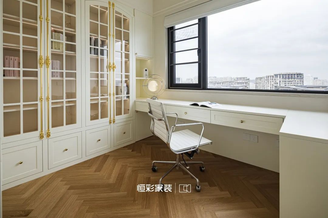 法式奶油收纳柜采用木板与玻璃门相间的形式,每一本书都是一段旅程,每一行文字都承载着梦想与远方。