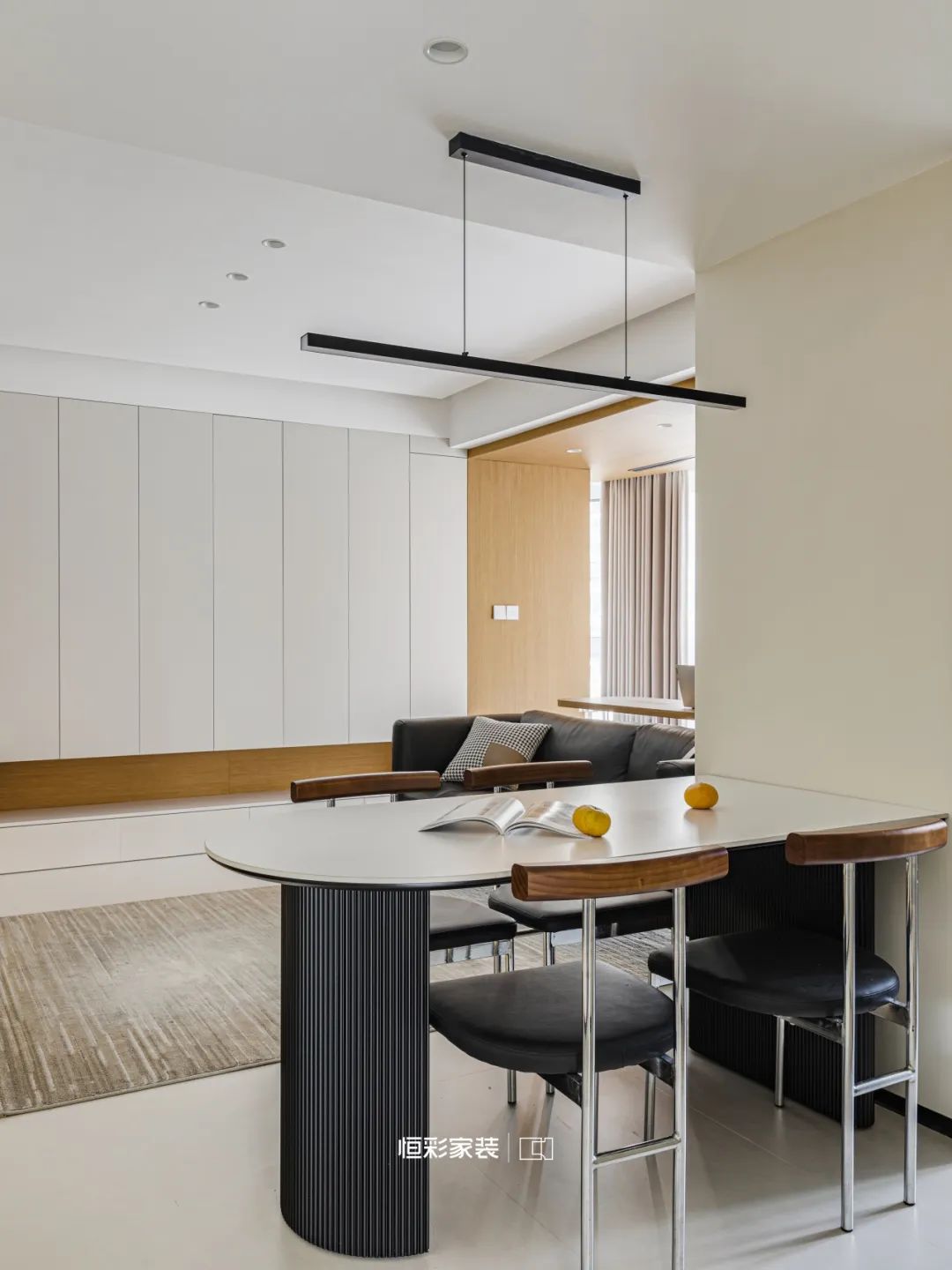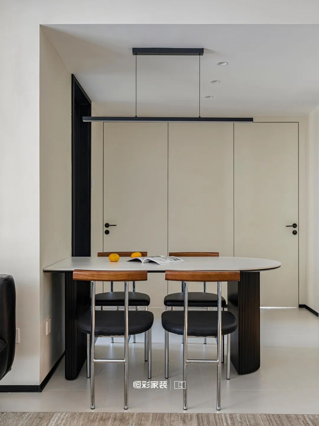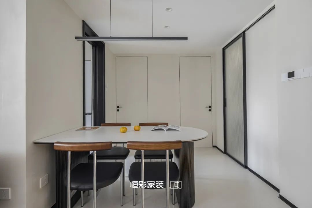 温柔的奶白洒满餐厅,自带柔美滤镜,极简一字长条吊灯似夜空中的星辰静静垂挂餐桌上方,曜石黑点缀一抹无尽的极简浪漫。