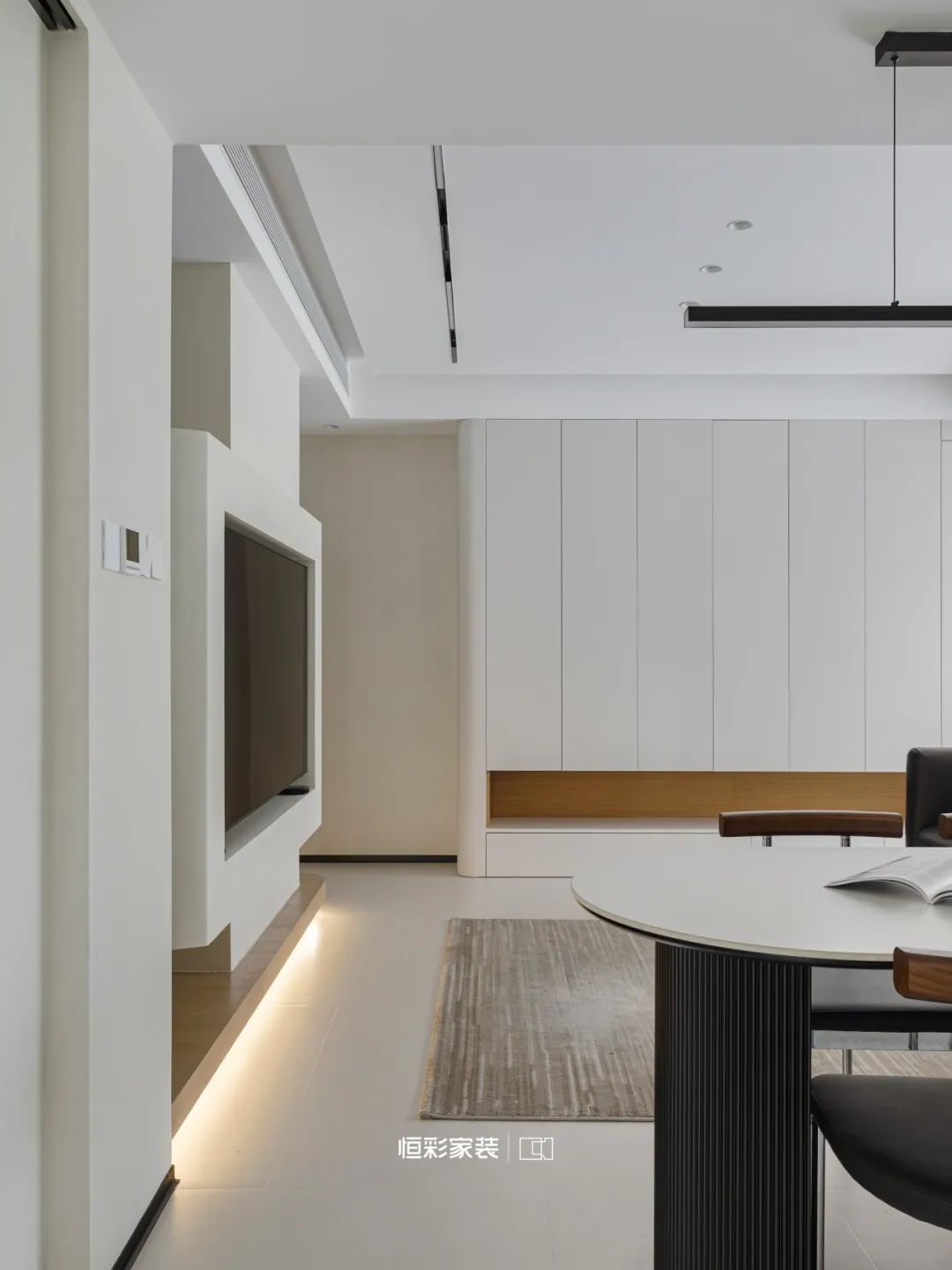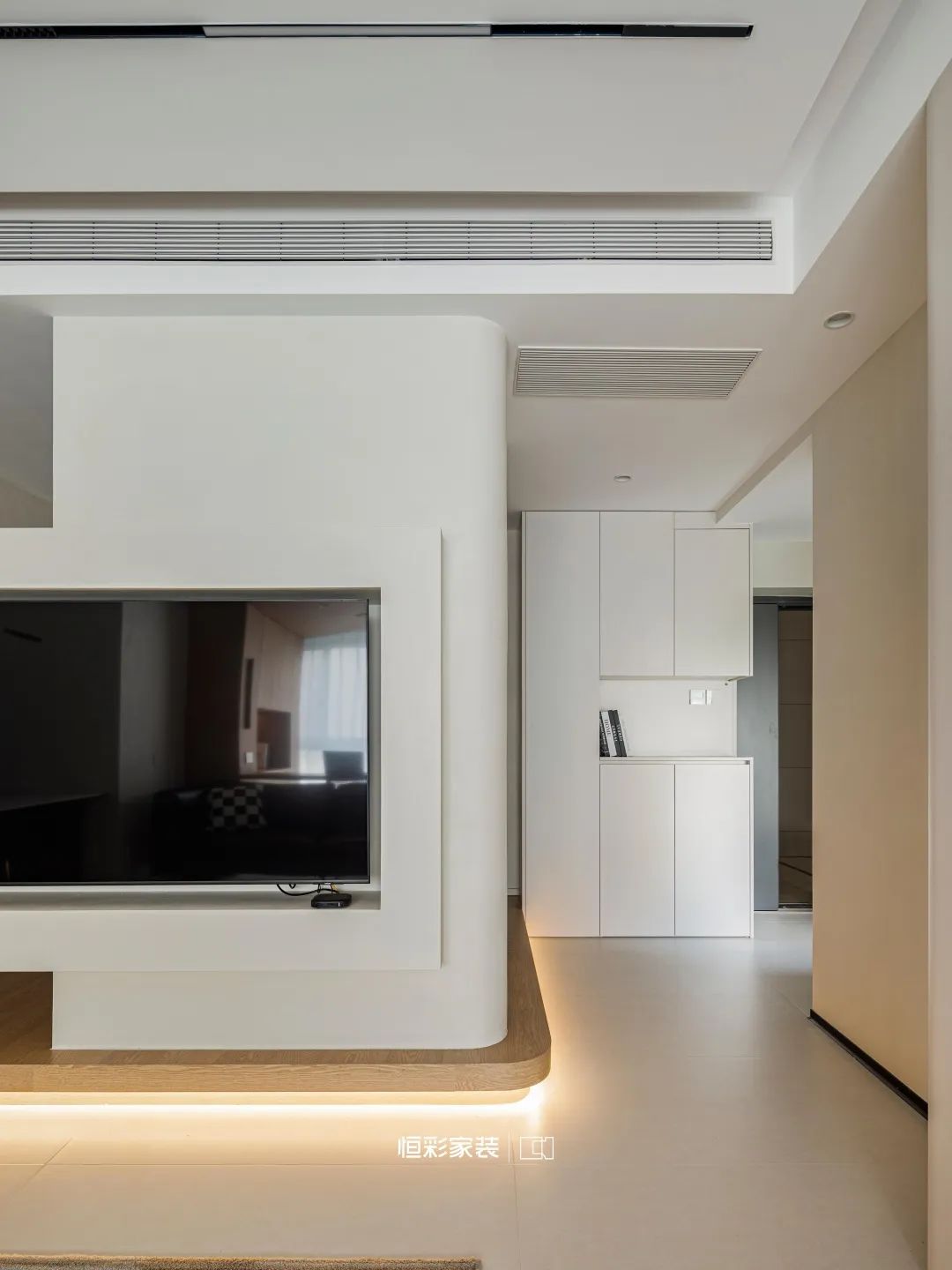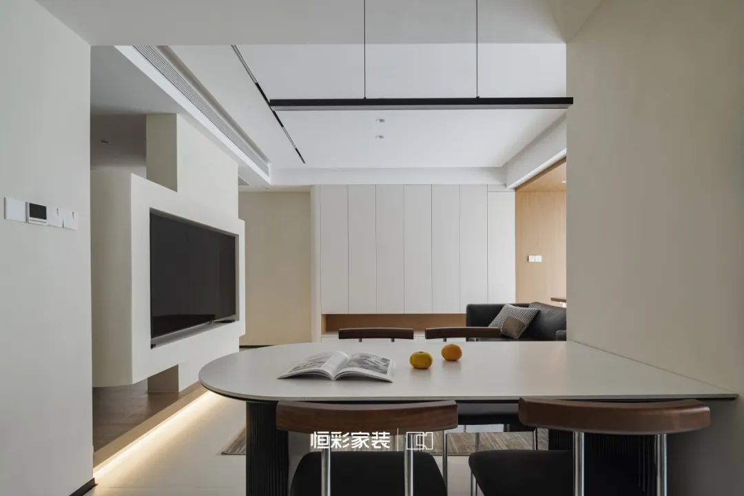 壁挂电视宛若一扇通向未知的窗口,透过它,似乎可以窥见远方的星辰,地台织就虚无梦境,柔和的灯带似是月色轻洒,微微晕染。