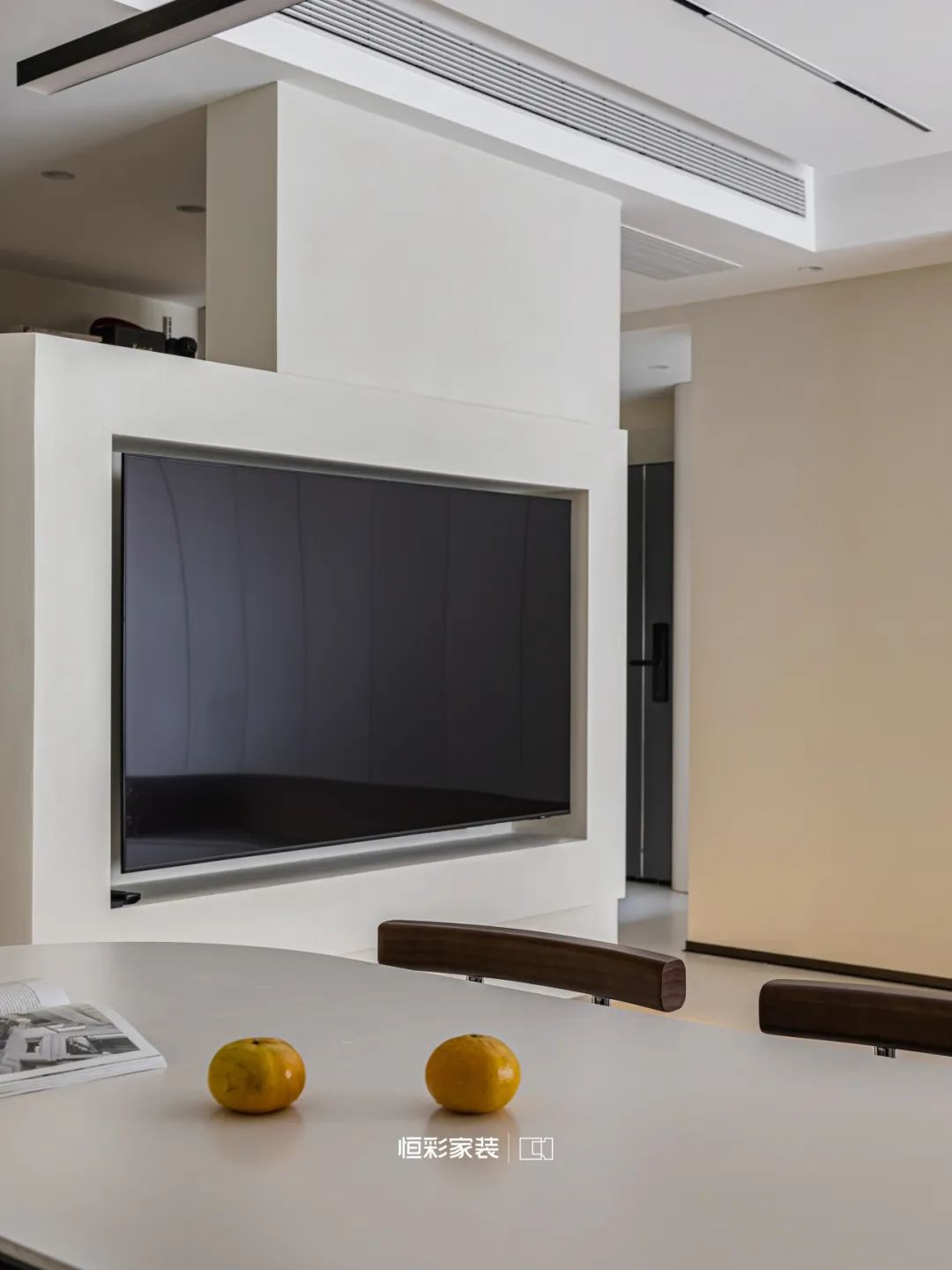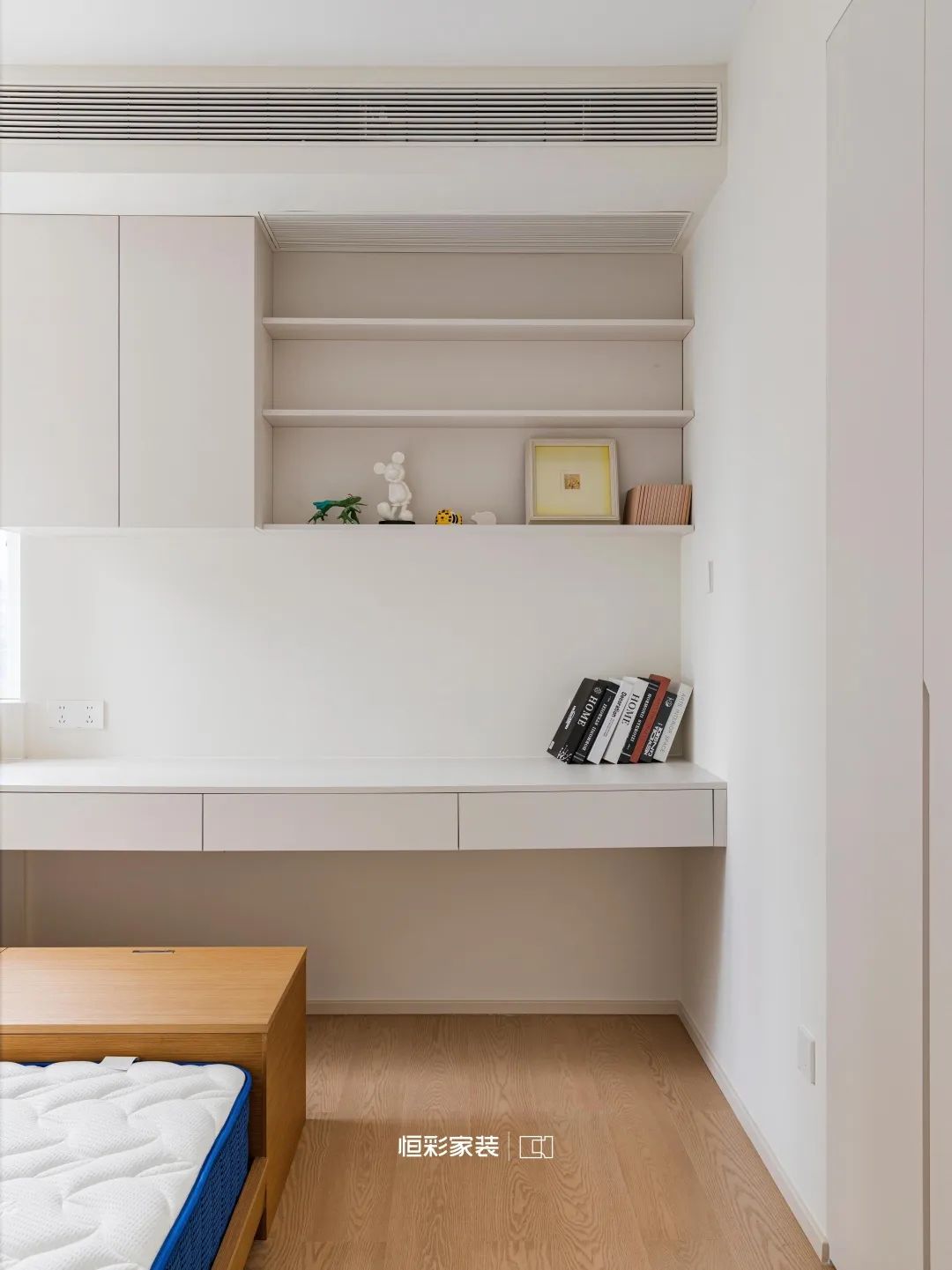 玄关之后,地台之上,留白之处,时间停驻,白色书架静静守护这个角落,让人在喧嚣中寻觅到一处安宁净土。