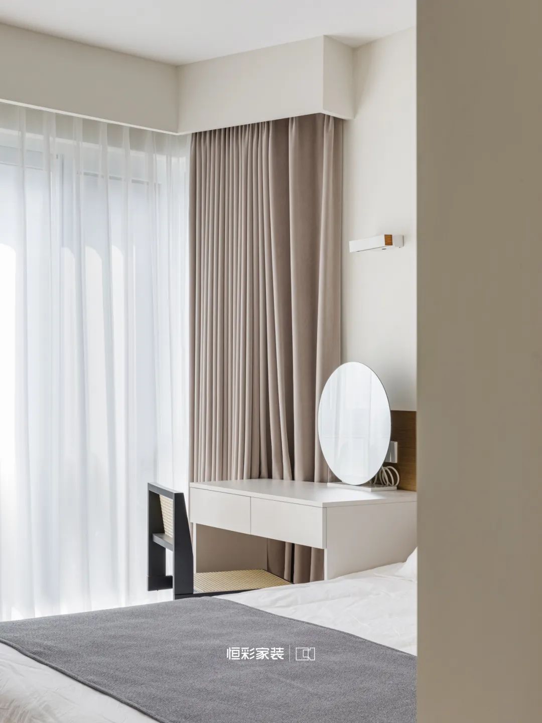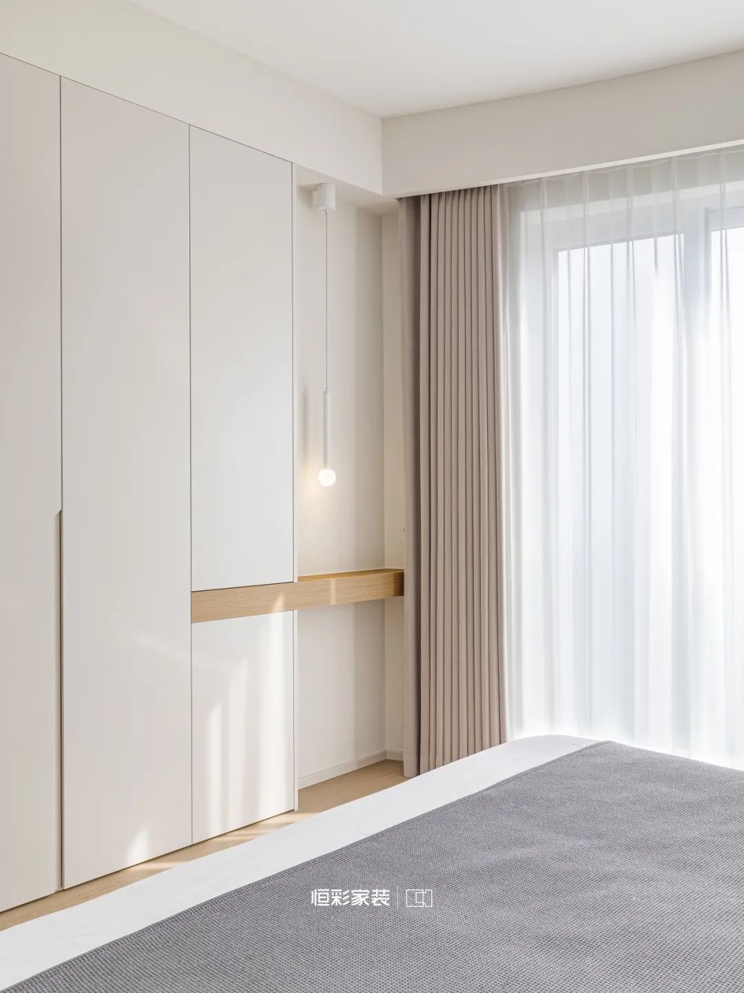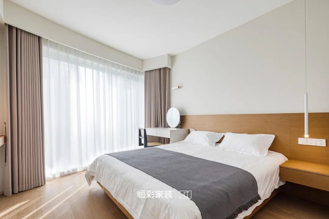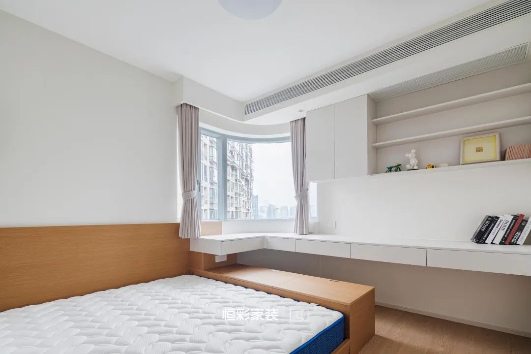 淡墨轻烟的晨光里,次卧风格与主卧一脉相承,又独有几分恬静,设计师以轻柔的灰白为画笔,地台式榻榻米结合书桌一体绘出一片宁静。