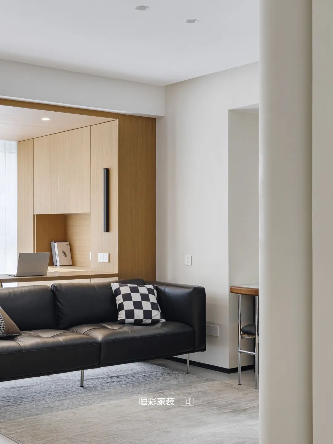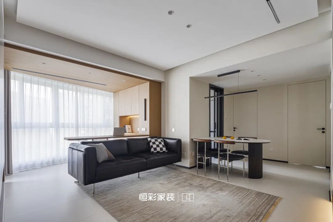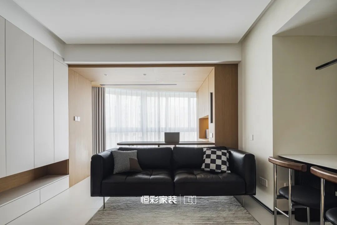 黑白灰最纯粹的色彩,轻轻拂去喧嚣,客厅已无茶几的繁复,高脚真皮沙发宛若深夜天幕,安静深邃,轻柔投入纯色地毯的怀抱。